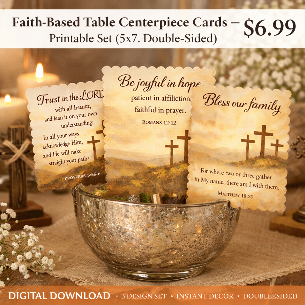 Create a warm, peaceful, and Christ-centered atmosphere at your table with this Faith-Based Table Centerpiece Card Bundle. Designed to inspire reflection and meaningful conversation, these elegant cards are perfect for homes, churches, Bible studies, prayer groups, Sunday dinners, and special gatherings.