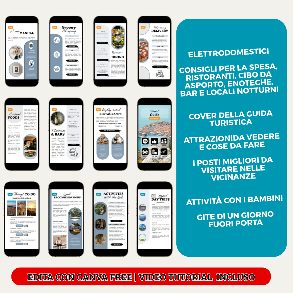 Questa welcome book digitale e travel guide è stata creata grazie ai tanti feedback degli host, che hanno acquistato i miei prodotti negli anni e i consigli dei loro ospiti su cosa gli sarebbe piaciuto o sarebbe stato utile trovare nel libro di benvenuto. Specifico per affitti brevi, super-ottimizzato.