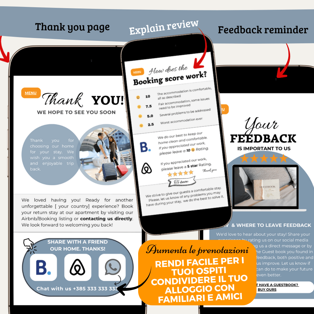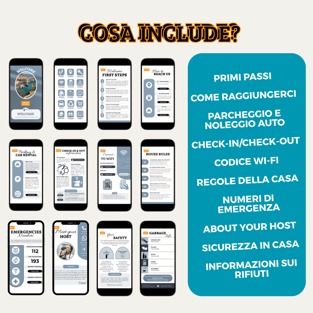 - ✔️ Riduci al minimo il tempo dedicato a rispondere alle domande dei tuoi ospiti, le troveranno tutte nella guida. Nel tempo potrai aggiungere, eliminare e modificare i templates a seconda del tuo bisogno futuro.