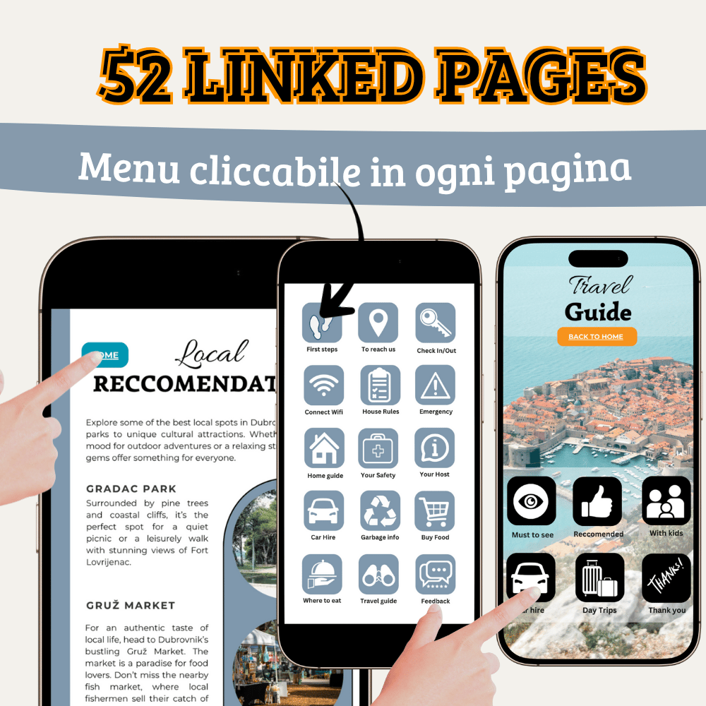 La guida digitale interattiva da condividere via chat Airbnb, email, WhatsApp, Telegram, social, link in bio... versione BILINGUE (italiano e inglese).