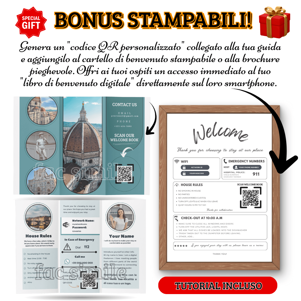 - Aggiungere il tuo QR CODE e come scaricare il PDF della brochure o cartello di benvenuto.