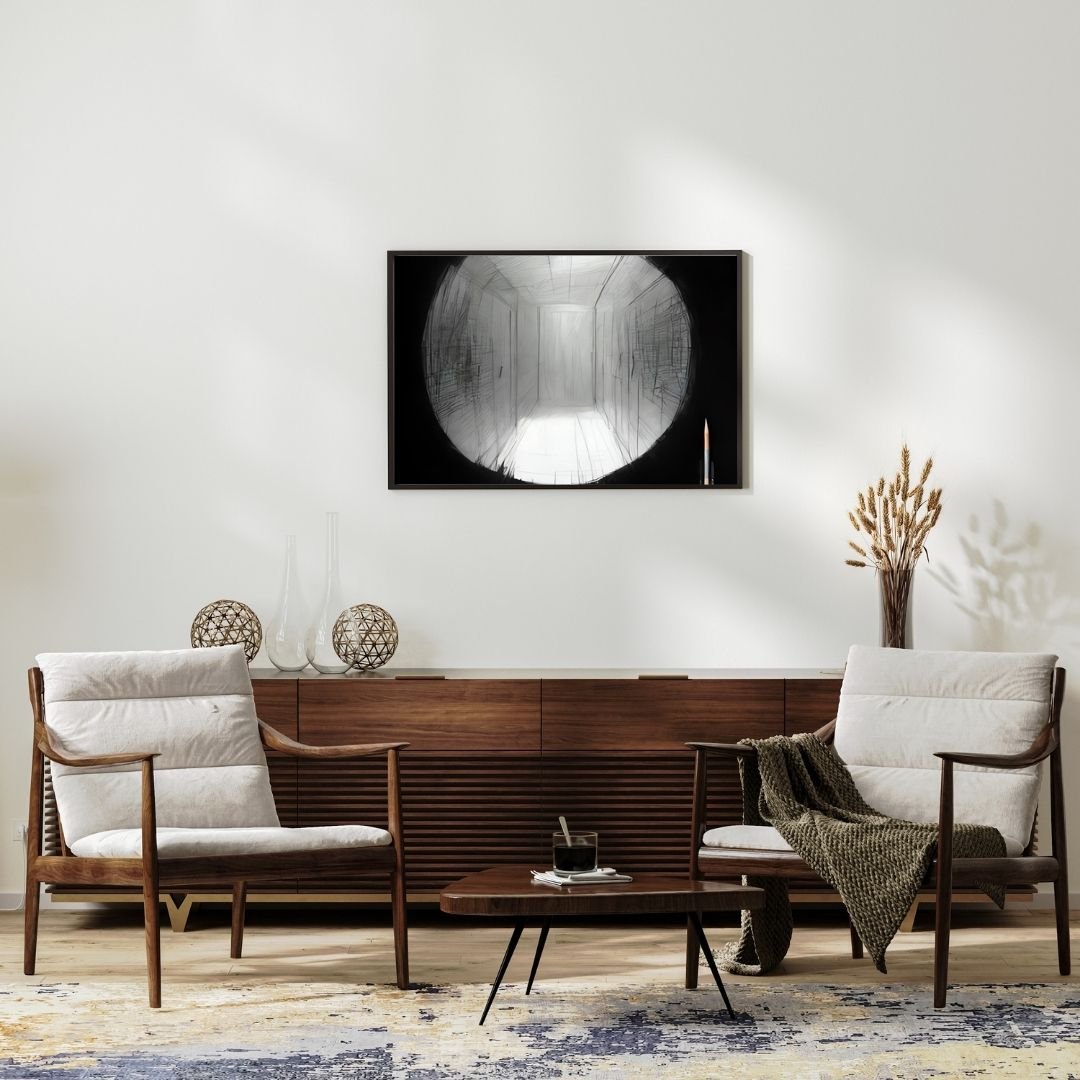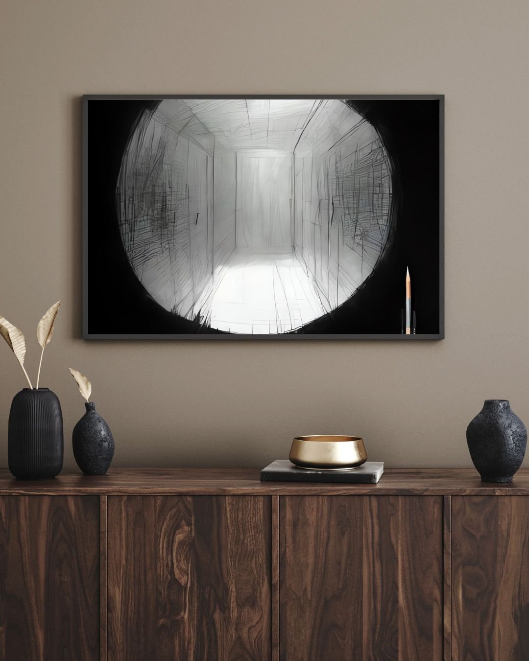 Experience the beauty of light and shadow in motion with this surreal corridor artwork. What started as a simple lamp photo has been reimagined into a striking piece of futuristic wall art, an abstract modern vision where depth, contrast, and geometry come to life.