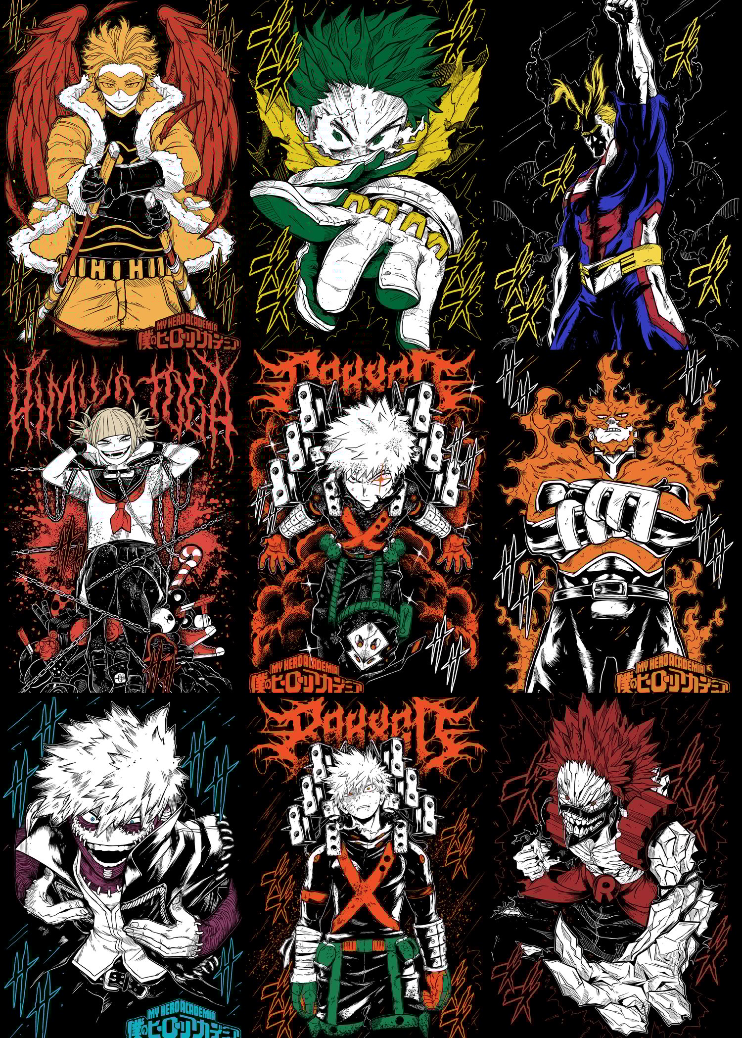 Diseño digital en alta resolución, inspirado en la fuerza, el estilo y la oscuridad de los personajes más icónicos de My Hero Academia: Hawks, Deku, All Might, Toga, Bakugo, Endeavor, Dabi, Red Riot.
