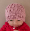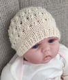 This 8ply/DK baby Beanie has a 1x1 rib brim then is worked in an eyelet and stocking stitch pattern then has a stocking stitch crown.