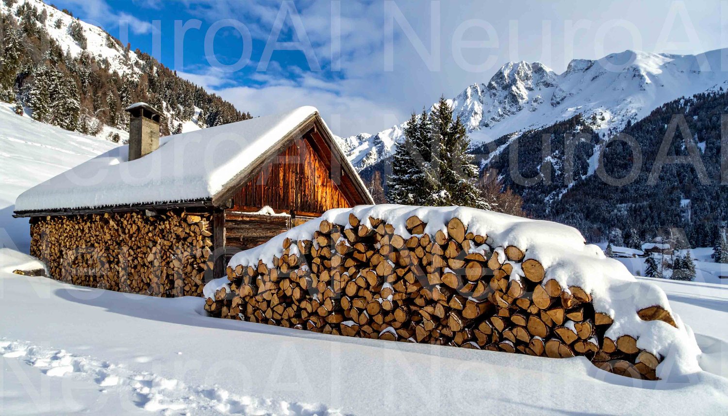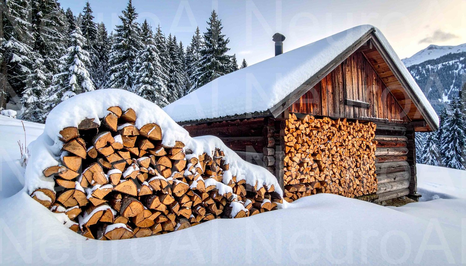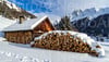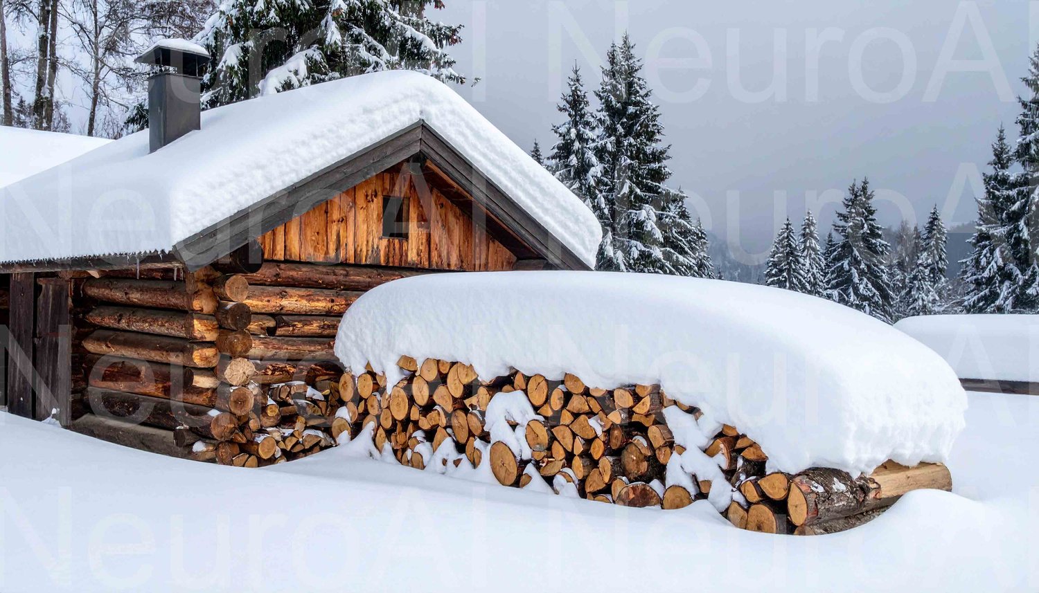 Cozy log cabin with snow covered firewood in winter forest