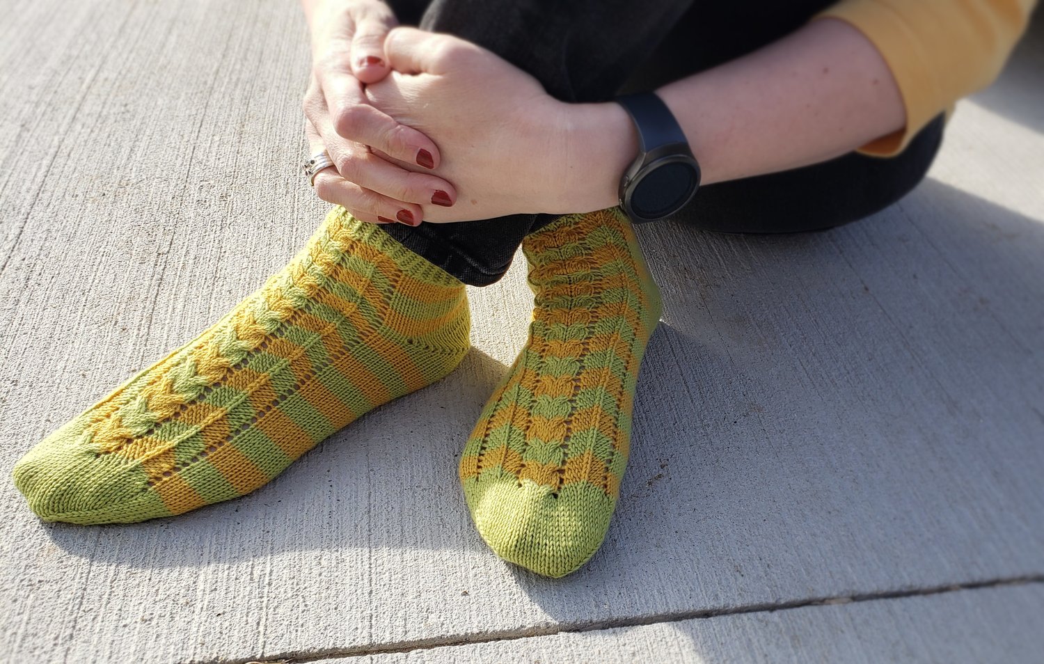 Sample used Knitologie Super Sock (75% Superwash Merino Wool/25% Nylon, 437 yd 400 m/100 g) in colorways Succulent (MC) and Tuscan Sun (CC)
