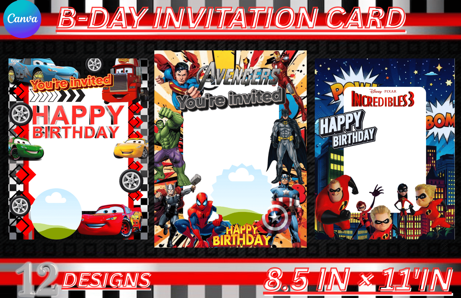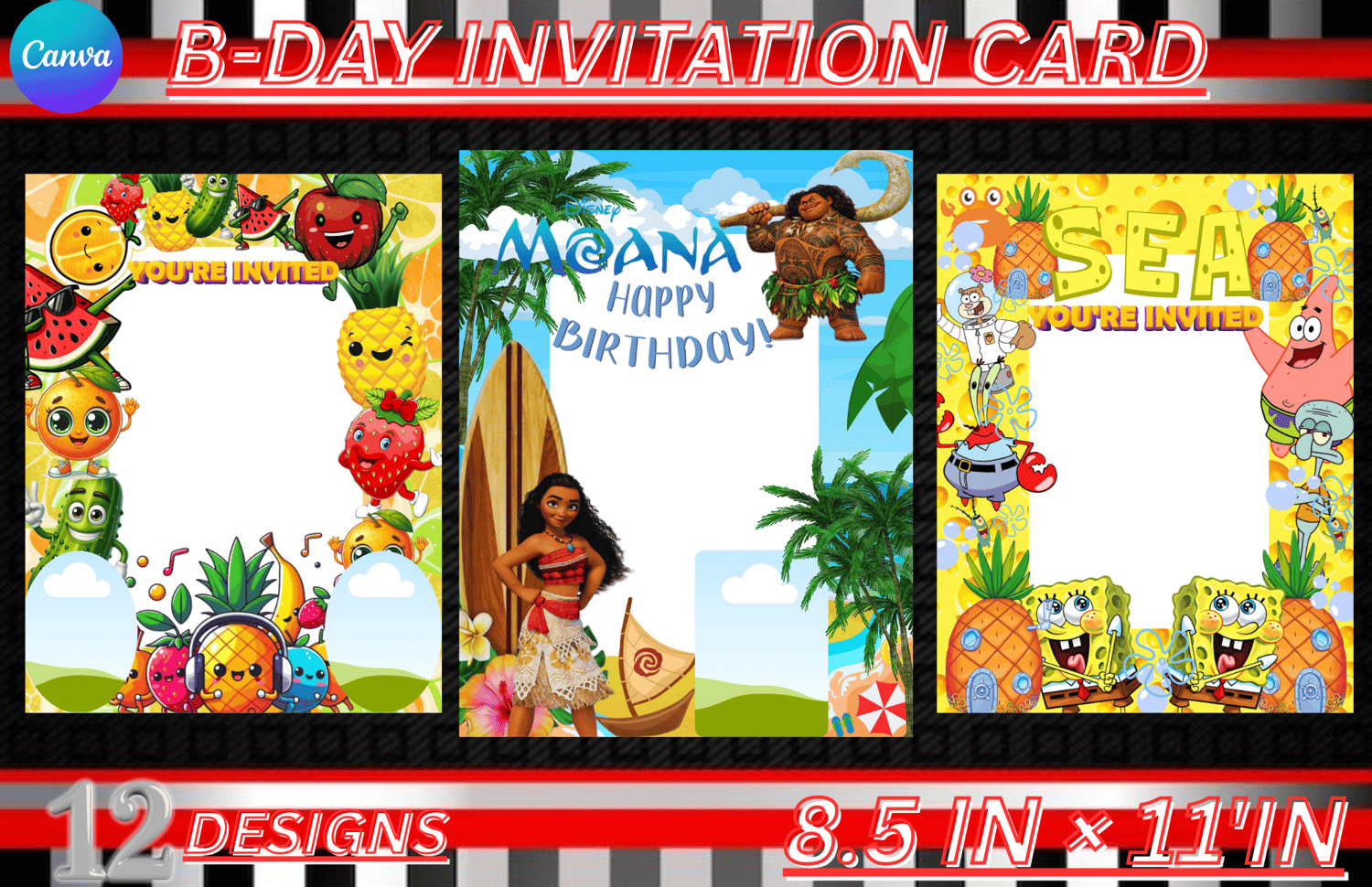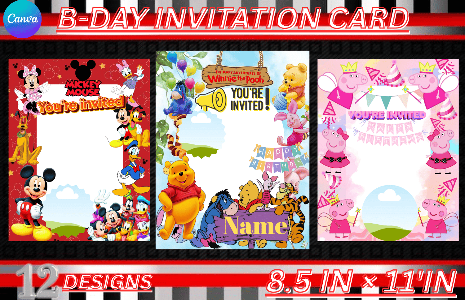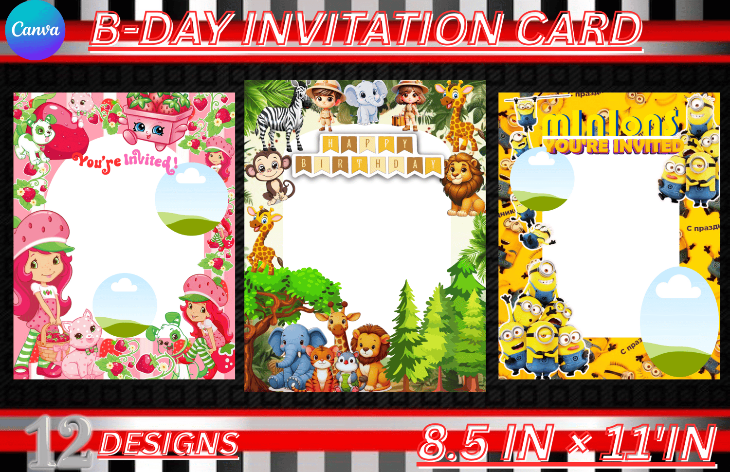 Birthday invitation card includes 12 design with colorful characters. These are the most requested design.