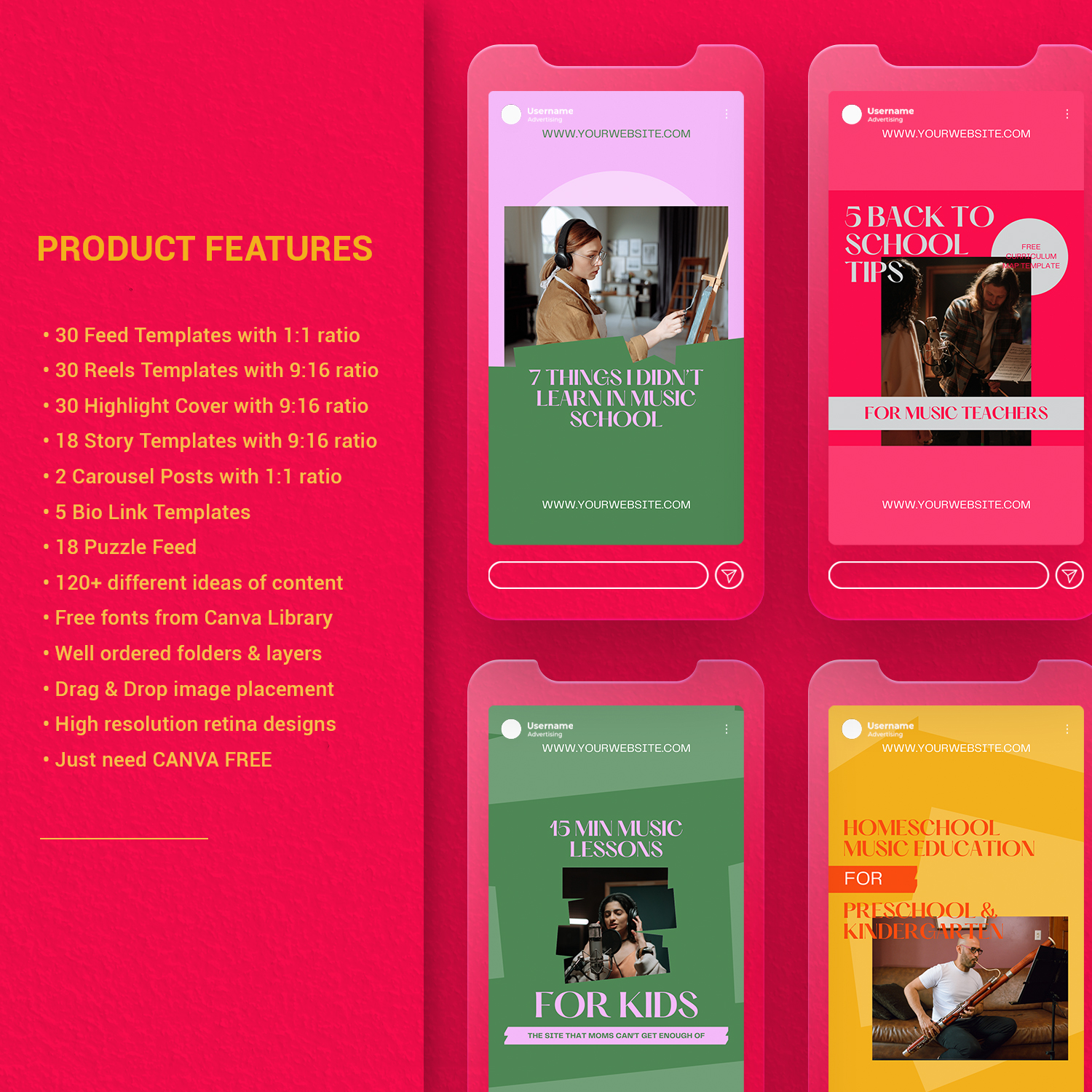 - 25 Reel Templates: Share engaging content like studio tours, music tips, and artist collaborations using dynamic, eye-catching designs.