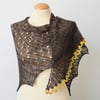 Whiskey on the Rocks is an asymmetrical triangle or “boomerang” shawl worked sideways on the bias in one piece. The instructions for the body with the eyelet patterning are provided both charted and written out.