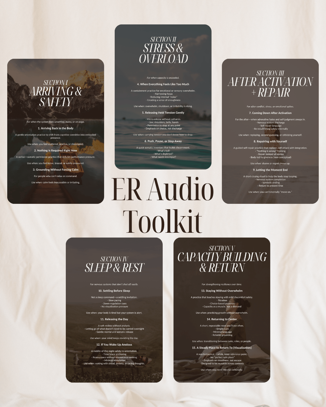 15 guided practices for stress, sleep, safety, and capacity—designed to support real moments, not ideal ones.