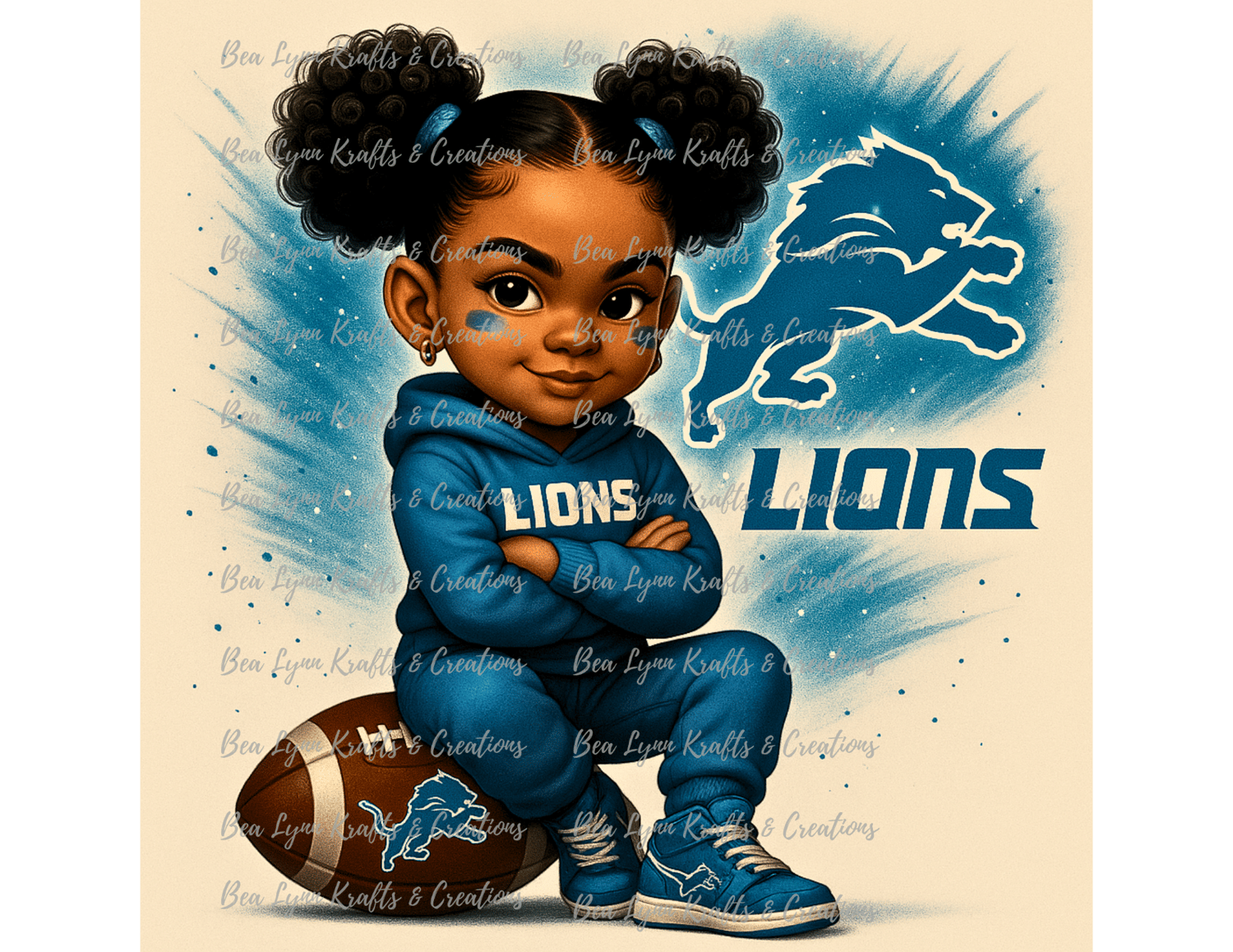 This Detroit Lions Confident Girl PNG showcases an adorable 3D-style cartoon girl sitting proudly with her arms crossed atop a Lions-branded football. She wears a blue Lions hoodie, matching joggers, and Lions sneakers, complete with bold blue face paint and gold hoop earrings. Her curly puff buns and self-assured smirk give her a powerful, confident game-day vibe fans will love.