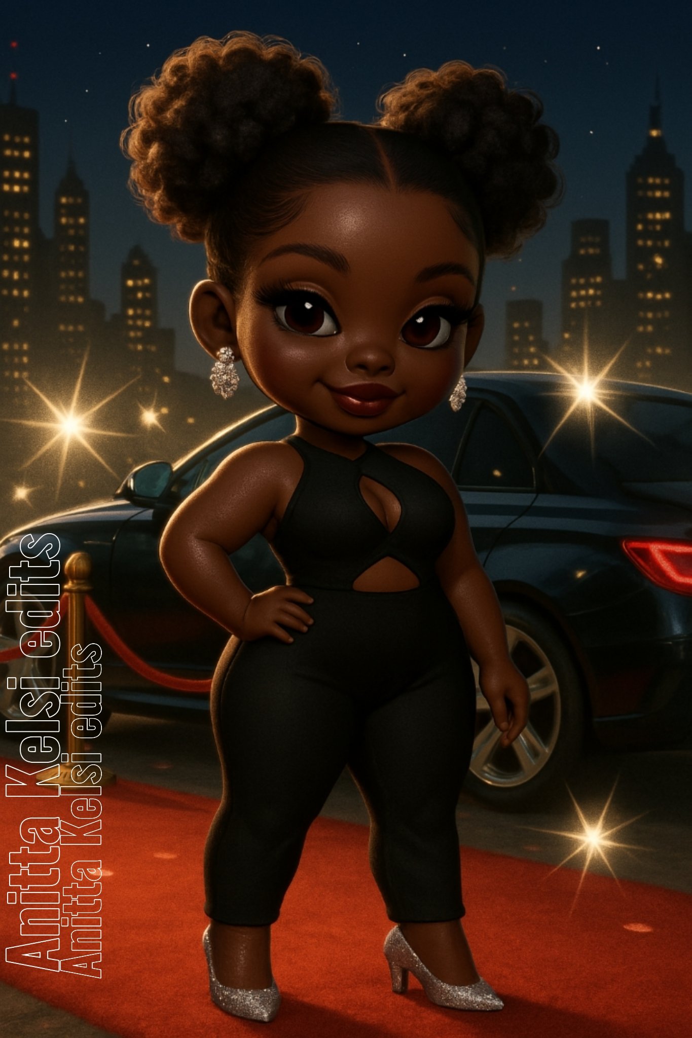 Step into star-studded elegance with this hyper-realistic chibi illustration featuring a stunning melanin queen in a sleek black cut-out jumpsuit. Her radiant skin, sparkling diamond earrings, and shimmering heels exude pure luxury as she poses beside a glossy luxury car under a glowing city skyline. Set against a velvet-rope red carpet scene, every detail — from the confident stance to the glimmering backdrop — celebrates high fashion, beauty, and melanin-powered confidence. Perfect for collectors, glam lovers, and fashion-forward fans of chibi art.