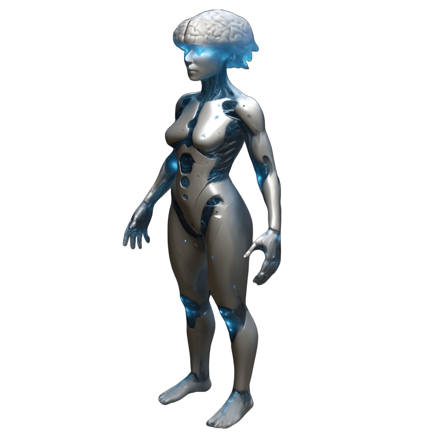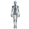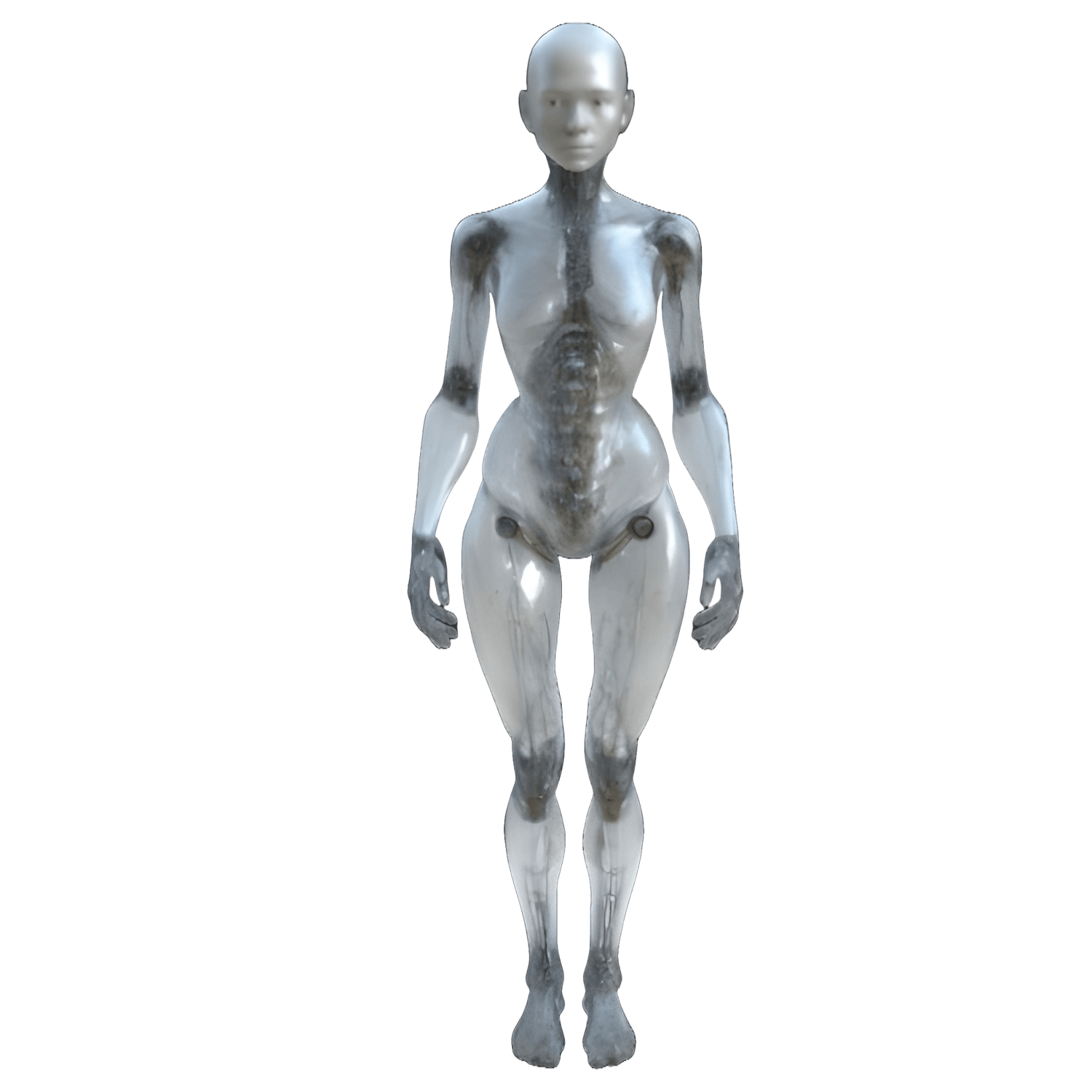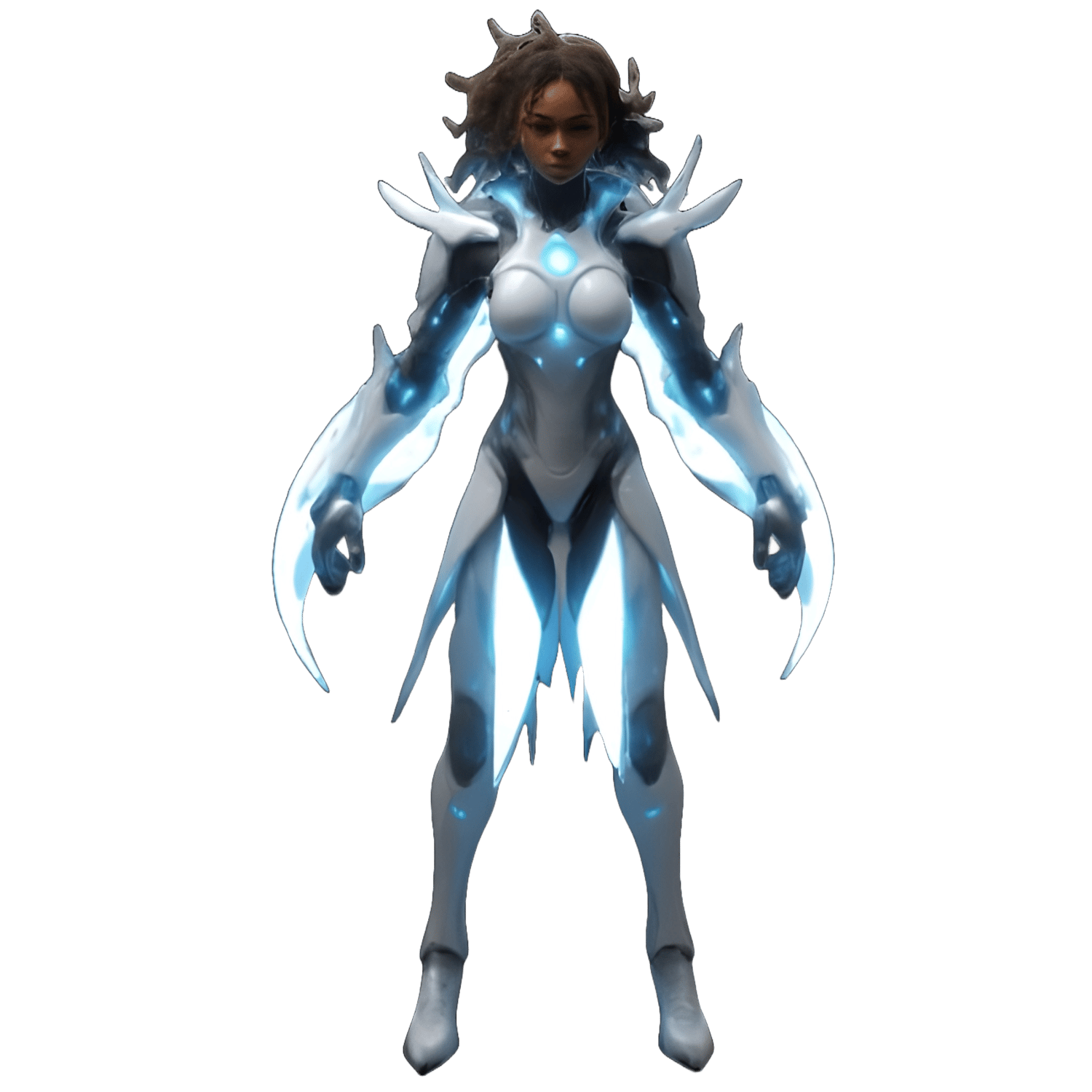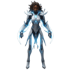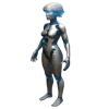 - Two futuristic female humanoid figures with sleek armor/bodysuit designs and blue energy accents
