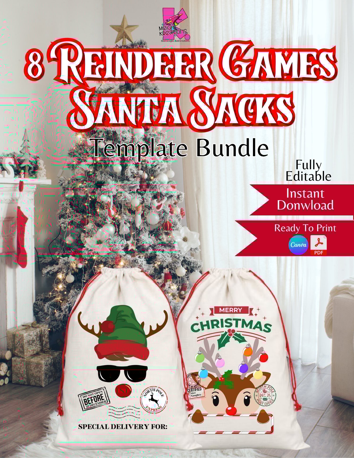 Bring the fun and magic of Christmas morning to life with this festive 8 Reindeer Games Santa Sacks Template Bundle. These eye catching designs are perfect for personalized holiday gifts, family traditions, Christmas Eve boxes, and custom orders for your customers who love something unique.
