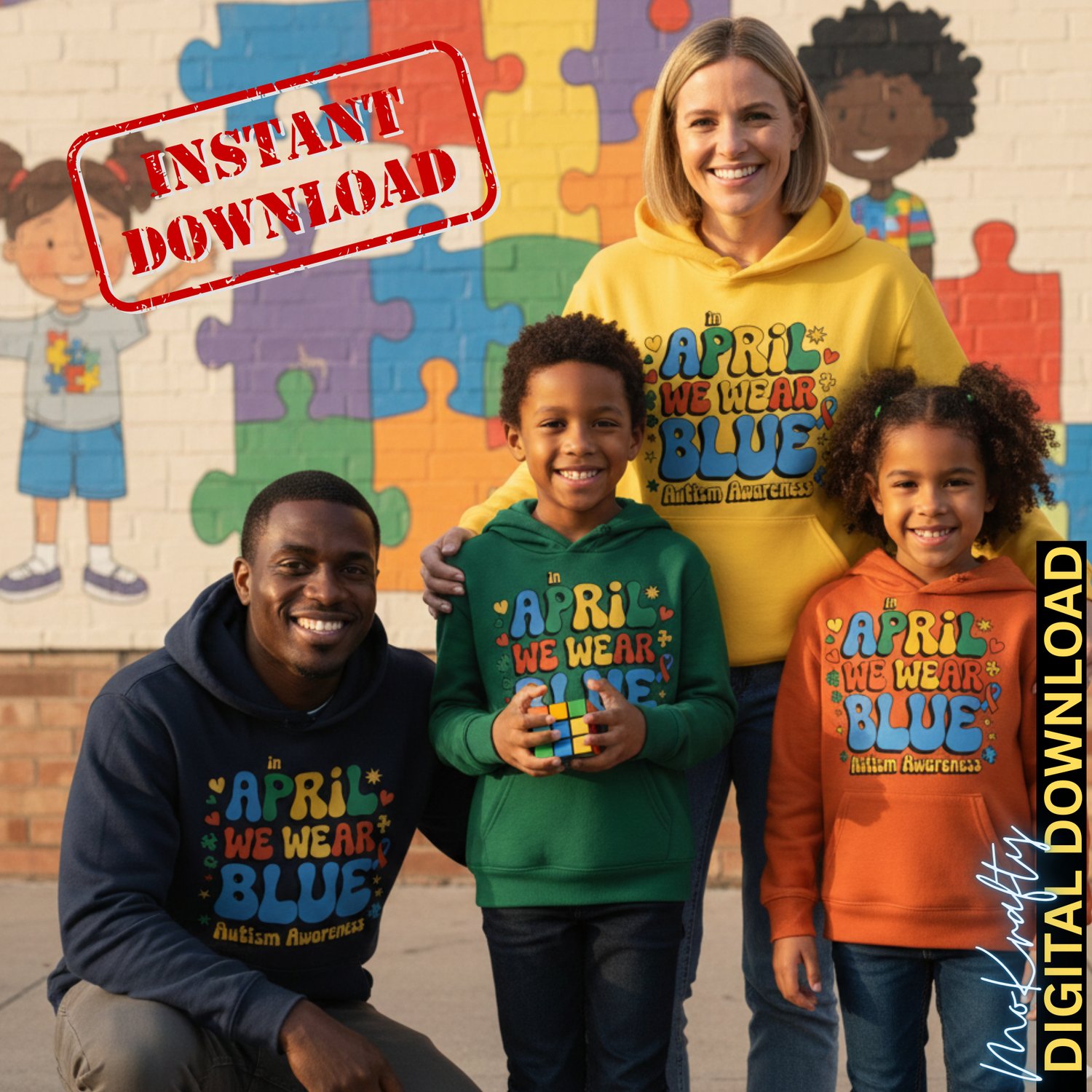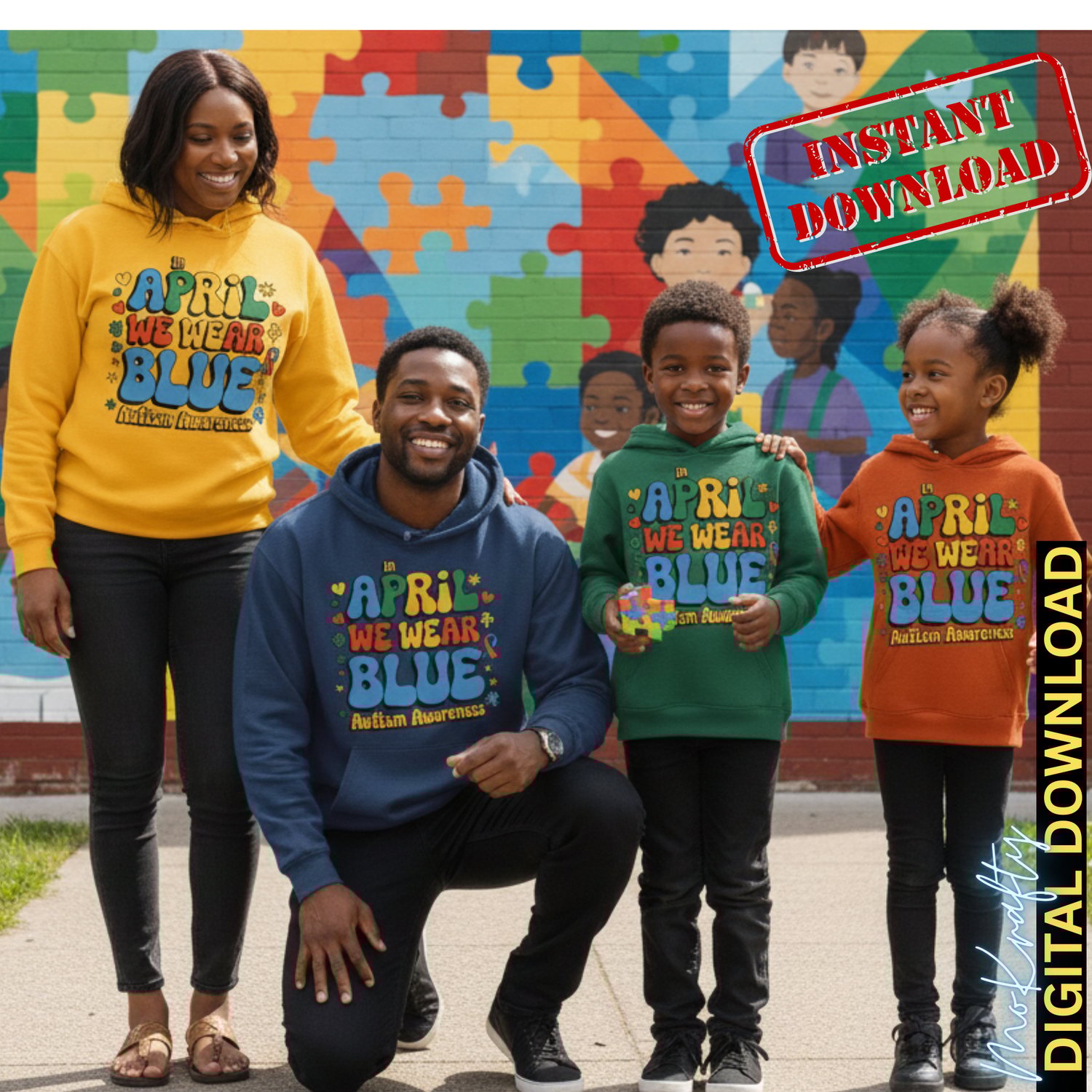 Celebrate neurodiversity with this vibrant, retro-inspired "In April We Wear Blue" digital design. Featuring groovy 70s-style bubble lettering and classic puzzle piece accents, this PNG is perfect for creating awareness apparel that stands out.