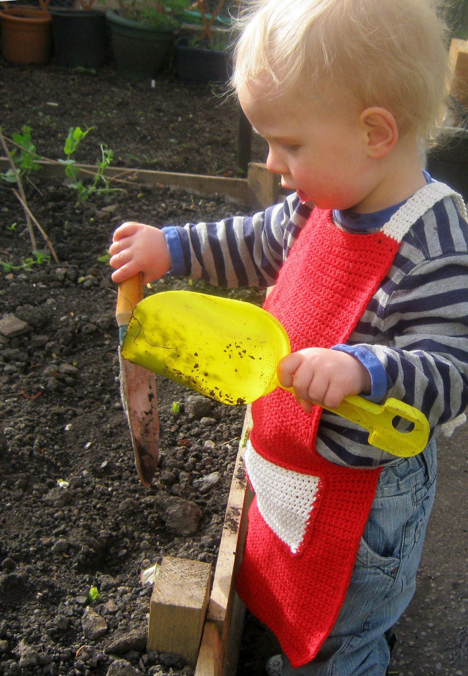 Instructions to make a simple cotton DK apron for children age 2 to 6 years.