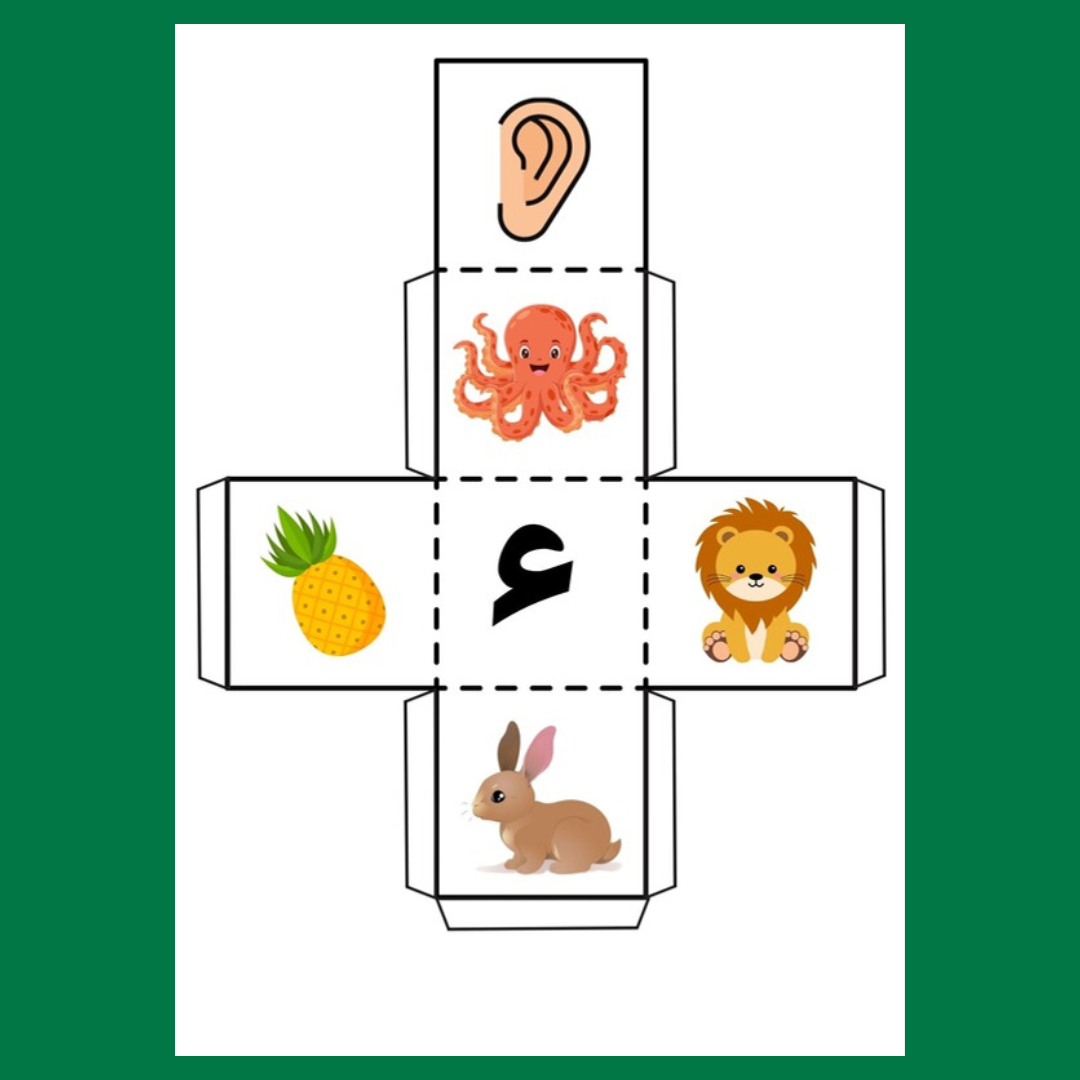 📄 28 صفحة تحتوي على قوالب مكعبات جاهزة للطباعة، كل مكعب يمثل حرفًا من الحروف العربية مع صور جذابة لكلمات تبدأ بهذا الحرف.