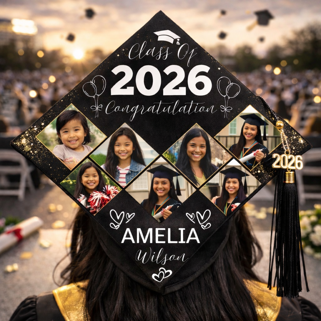 Whether you choose one of our viral 2026 quotes, upload your favorite photo, or create a collage that tells your story, your topper will turn heads, photograph beautifully, and become a keepsake long after the tassel turns.