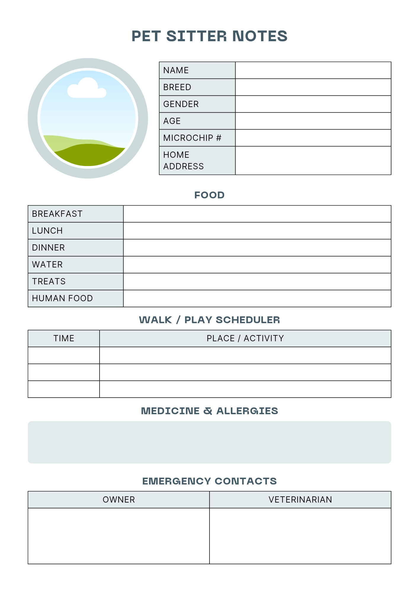 3. 🐾 Elegant Pet Sitter Notes (A4) – Leave clear instructions for your sitter with sections for feeding, meds, quirks, and emergency contacts.