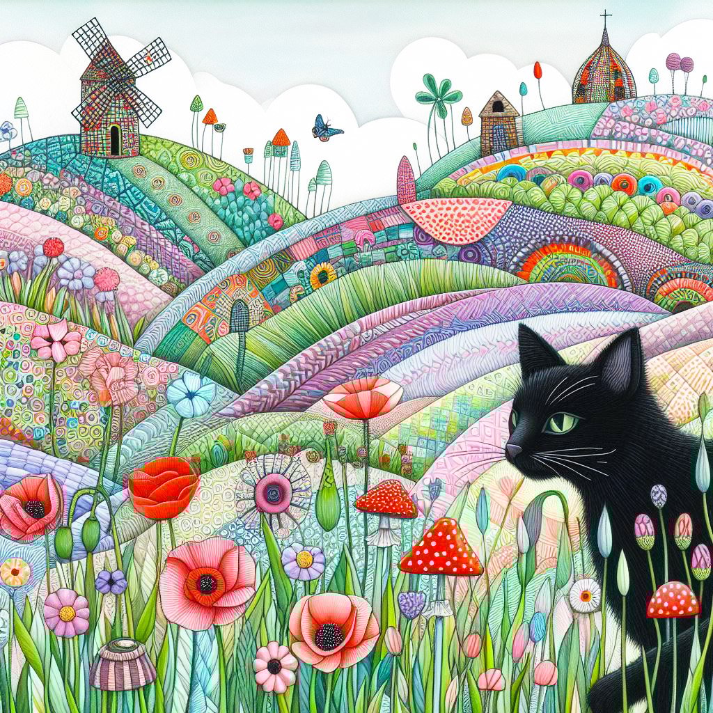Playful Black cat & high patterned hills with poppies, daisies, & toadstools. There are small houses at the top of hills & a windmill made of colourful mosaics.