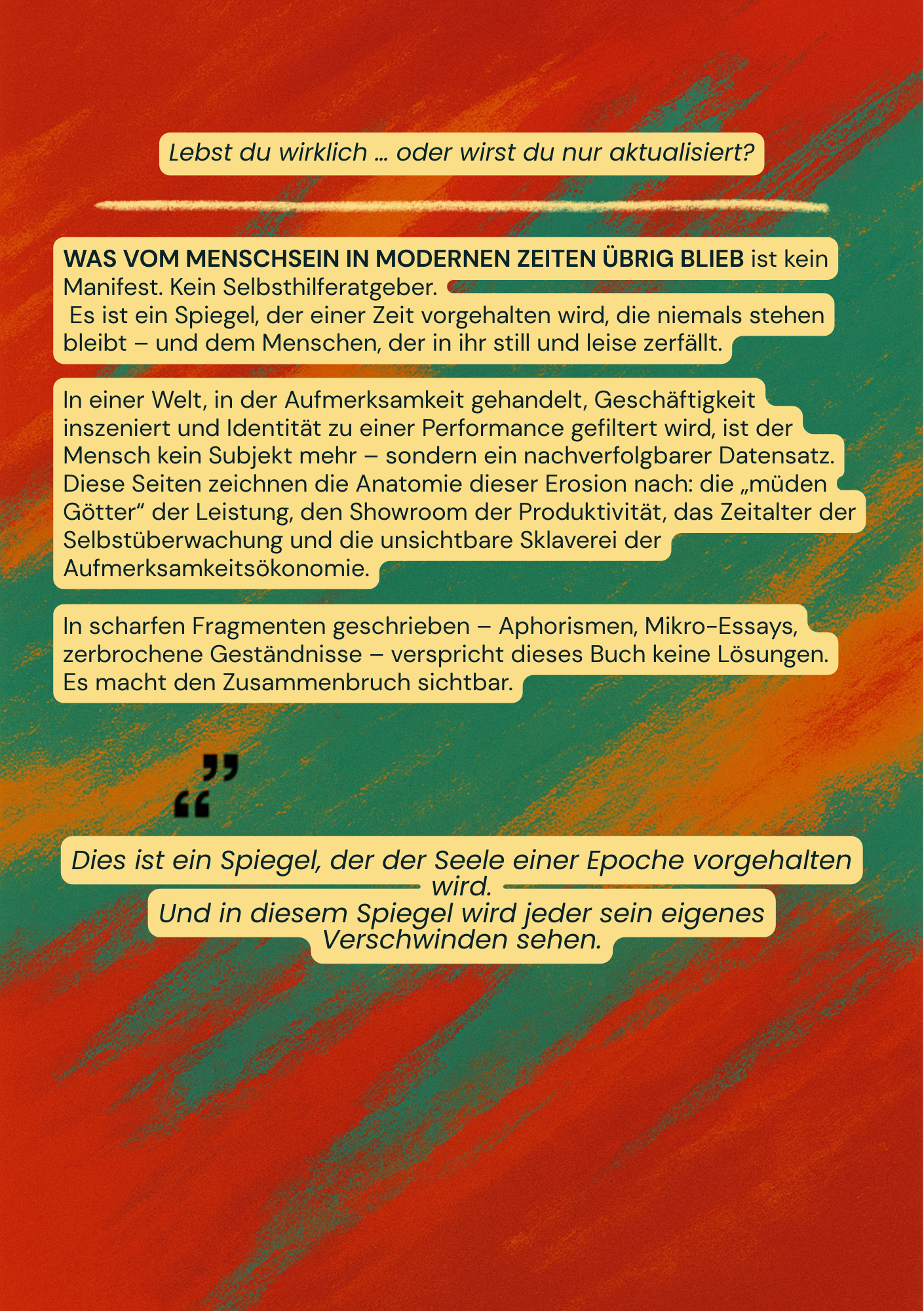 Dieses Buch ist: ein Spiegel – nah genug, um dich unruhig zu machen, und ehrlich genug, damit du dich erinnerst.