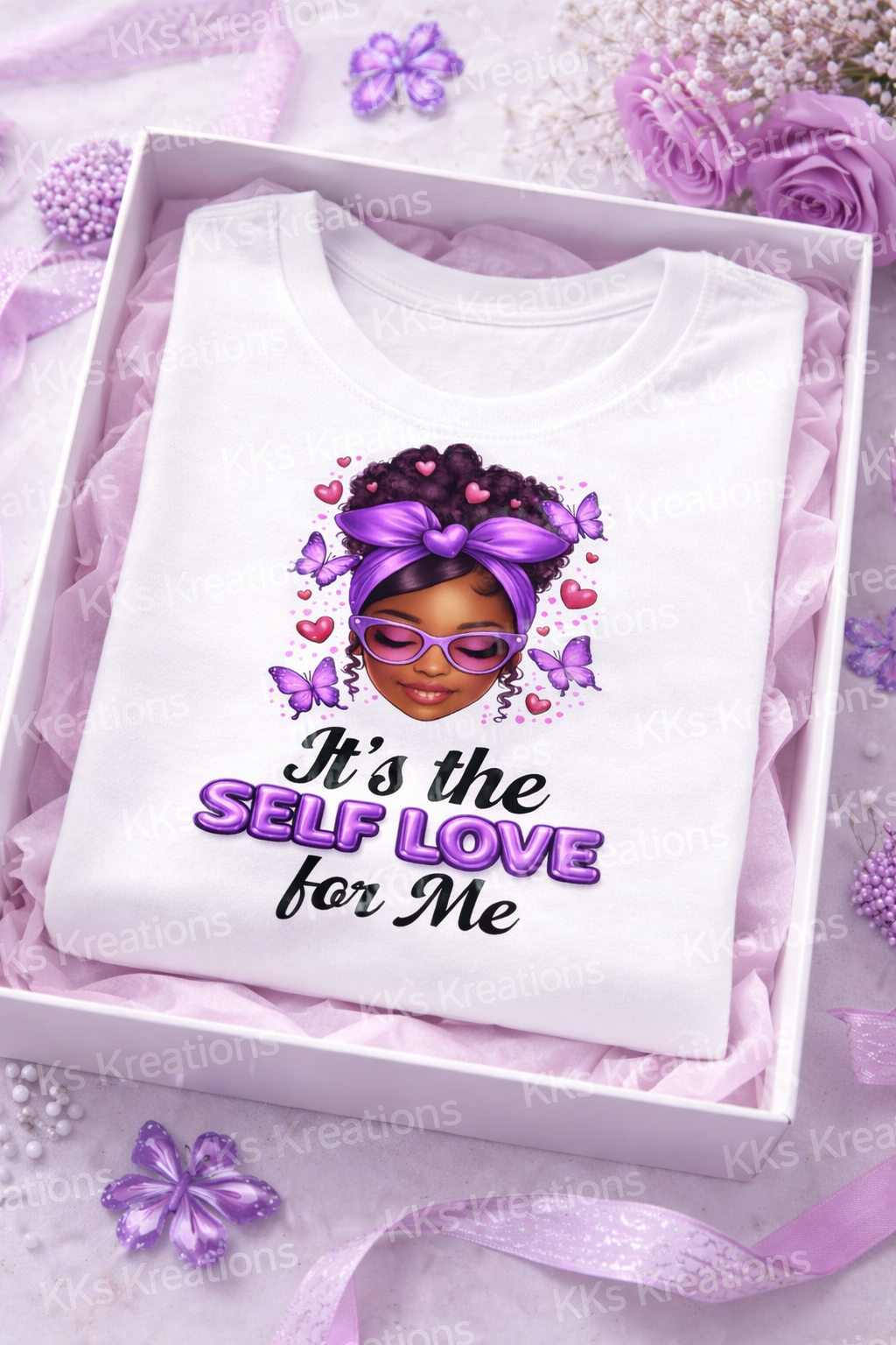 It’s the SELF LOVE for Me graphic tee featuring a confident beauty, bold purple details, and that unapologetic energy. Large gold hoops. Short hair. Big confidence.