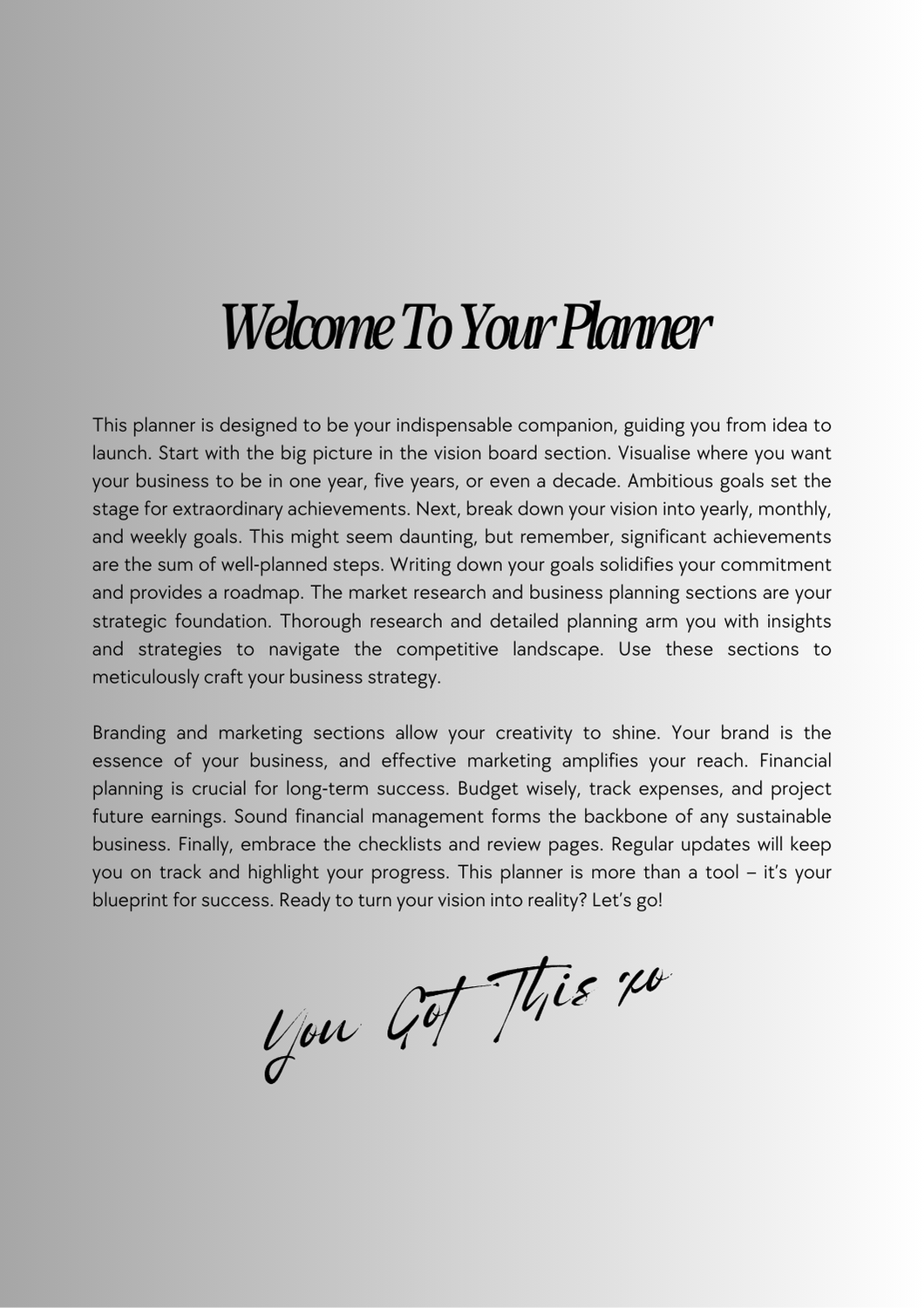 The Start-Up Business Planner is a comprehensive guide designed to help aspiring entrepreneurs turn their business ideas into reality. This planner provides step-by-step guidance on business planning, goal setting, financial projections, marketing strategies, and daily action plans. Whether you’re launching an online store, a service-based business, or a passion project, this planner will keep you organized, focused, and on track for success.