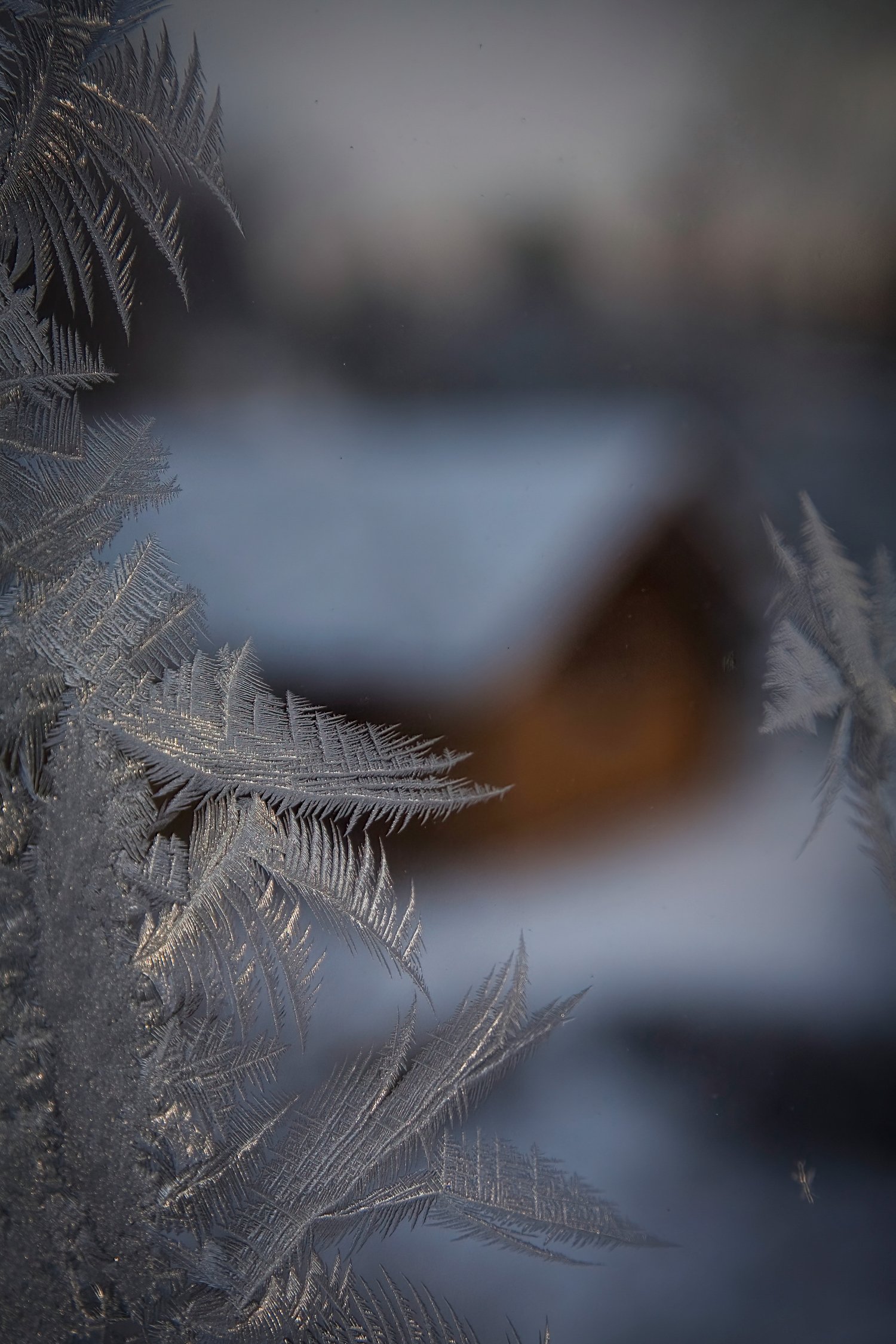 Ice art in the window. The silhouette of the neighbor's house in the background.