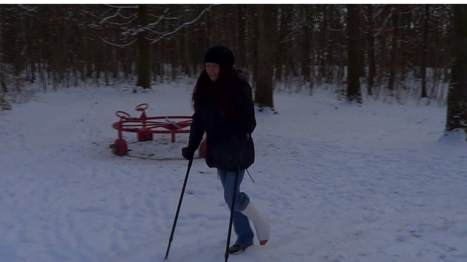 Oh God! Rose is right now outside in the heavy snow as she slowly crutches weight bearing whit her left foot, which is casted in a white SLWC. Her freezing toes is sticking out from the cast without any warm sock on top or anything, she must be so cold and so hurt. After just a little while, Rose did the right choice to crutch instead to prevent herself from getting more hurt. Some needed breaks and nice closeups of her freezing toes were done a few times today. Now after being out there in the winter forest way too long, let’s get Rose inside the car quickly.