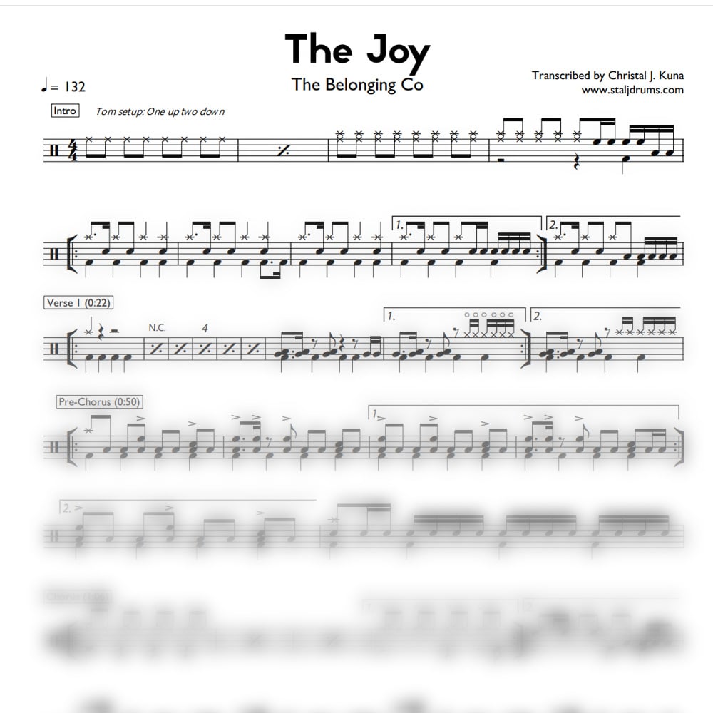 Drum sheet music for The Joy by The Belonging Co with timestamps and section markers.