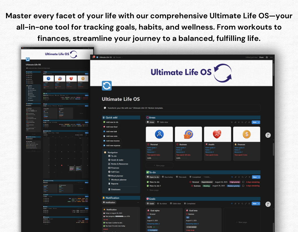Take control of your world with the Ultimate Life OS, an all-in-one Notion template designed to bring balance, productivity, and clarity to every aspect of your life. Stop juggling multiple apps and notebooks—this comprehensive dashboard is the single source of truth for all your goals, tasks, and personal growth.