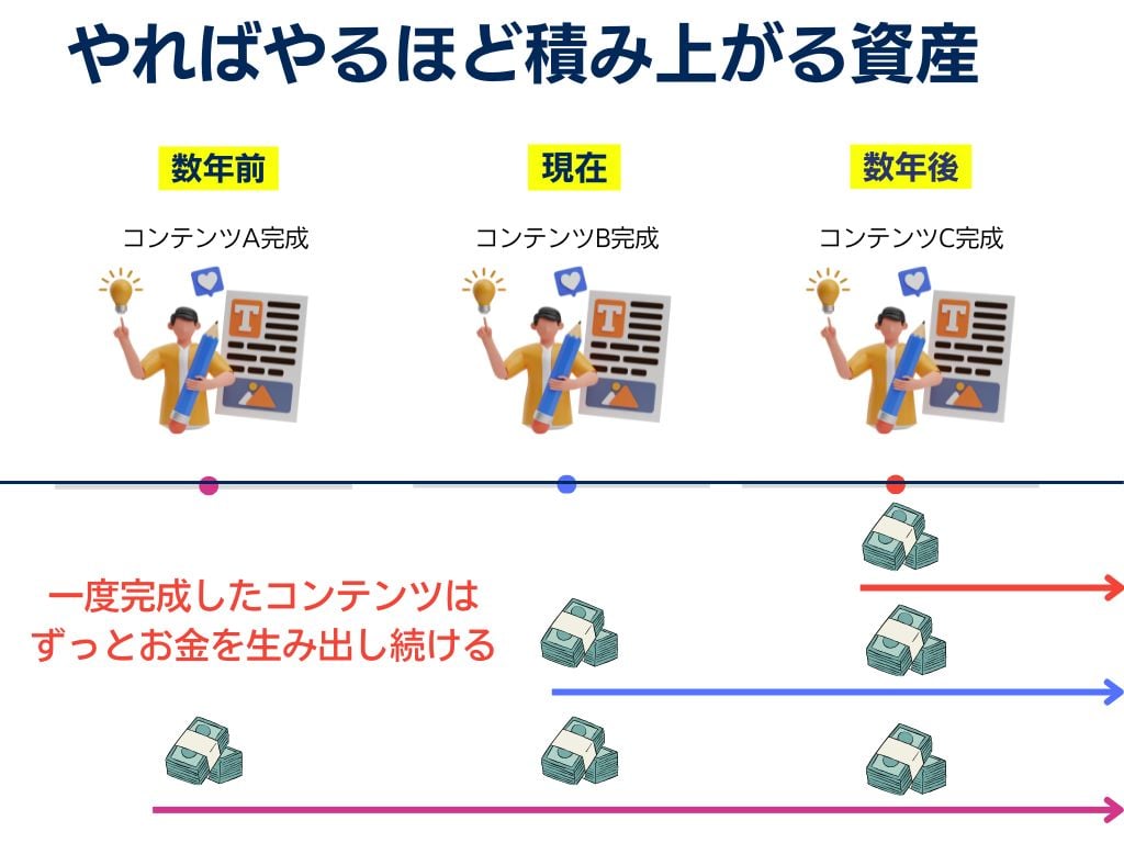 今月作ったコンテンツは、今この瞬間だけではなく、今後も持続的にお金を生み出してくれるのです。