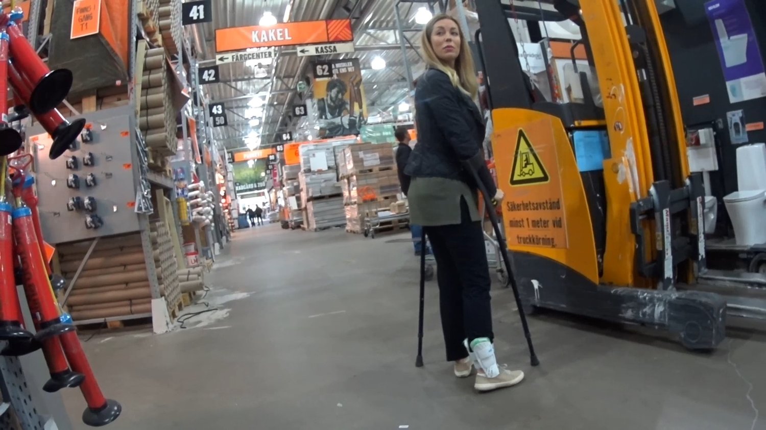 Despite an aircast, Melinda has managed to get a shoe on her injured right foot and, with the help of her crutches, enters a department store with building materials.Her flat shoes are beige white socks and she has dark jacket and pants.We follow her through the different departments as she looks at different things for her new home.