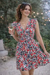 Craque pour cette petite robe légère et pleine de peps, parfaite pour l’été ou la mi-saison. Son motif mêle rouge vif, touches de bleu et noir sur fond blanc, pour un look frais et dynamique.