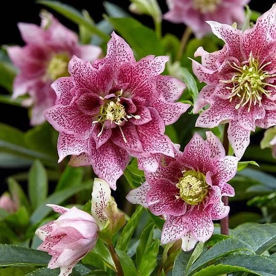 Helleborus are one of the most popular winter flowering bloom and are nicknamed the 'Christmas' or 'Lenten' Rose as flowers can often be seen flourishing on Christmas Day, lifting the gloomiest of spaces. This attractive Hellebore ‘Double Ellen Pink has large, freckled, nodding outward-facing flowers and will add colour to the border or containers in late winter to early spring, making it a fantastic choice for winter gardens!