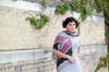The color sequence is worked in 4 colors over an odd number of stripes, with the first half of the pattern mirroring the second half after the center stripe. If you would like to experiment with a different color sequence there is a blank diagram on page 5 that you can color in. In the sample, each 28 row stripe used approximately 11 g or 55 yds/50 m of yarn. Each 4-row stripe used approximately 2 g or 10 yds/9 m.