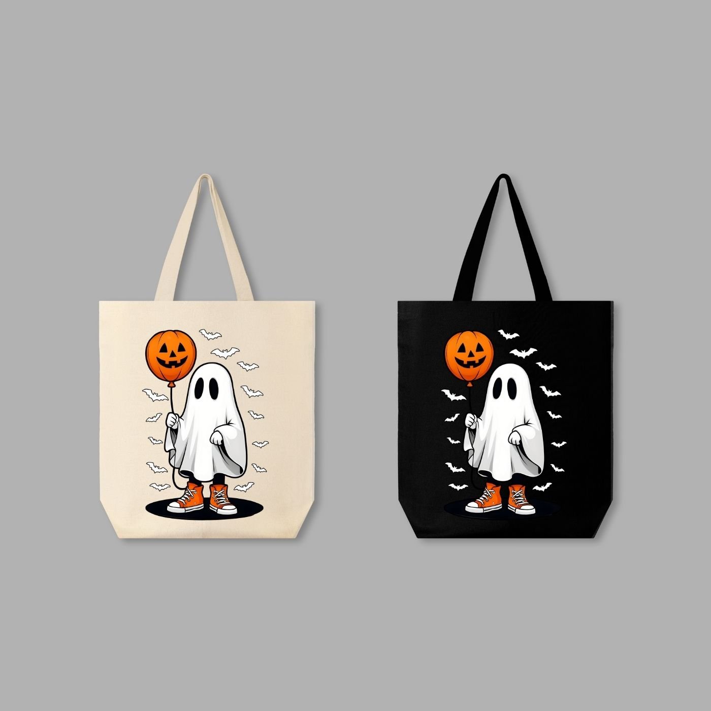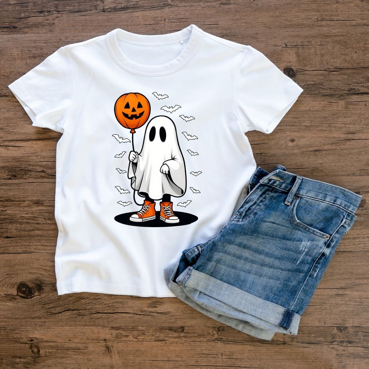 Bring spooky charm to your Halloween creations with this Cute Ghost Holding a Pumpkin Balloon sublimation PNG! This playful design features a cartoon ghost dressed in orange sneakers, holding a smiling jack-o’-lantern balloon with bats fluttering around. Perfect for those who love spooky-cute, funny Halloween designs with clean lines and bold color.