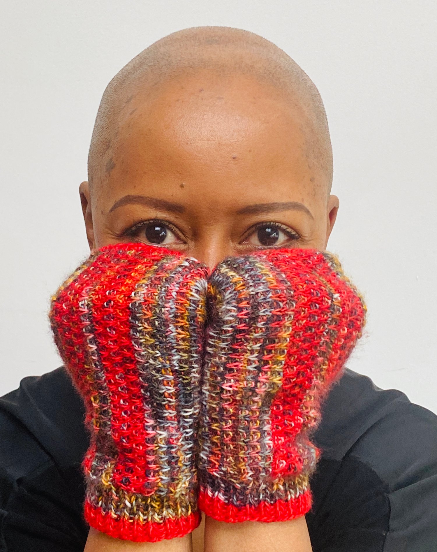 Instructions are given for 2 sizes depending on fit required. They’re designed to be worn with no ease for a relaxed fit so for example, my hand circumference measures 20 cm (7 3⁄4 in) and I'm wearing the M/L size but for a more snug fit, knit the smaller size.
