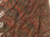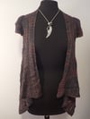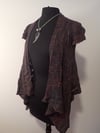 This rectangular wrap was knit from a lightweight wool blend, and should be handwashed and laid flat to dry. It is light and airy with the incorporation of a lace leaf pattern, and is next-to-skin soft. This wrap also has cap sleeves.