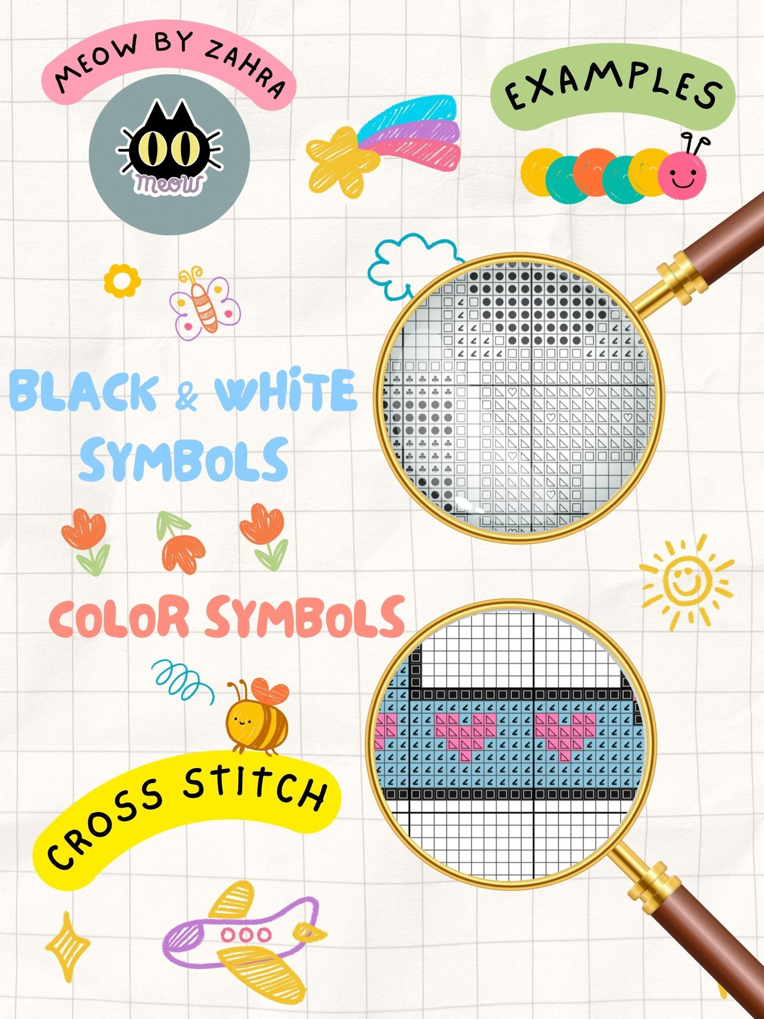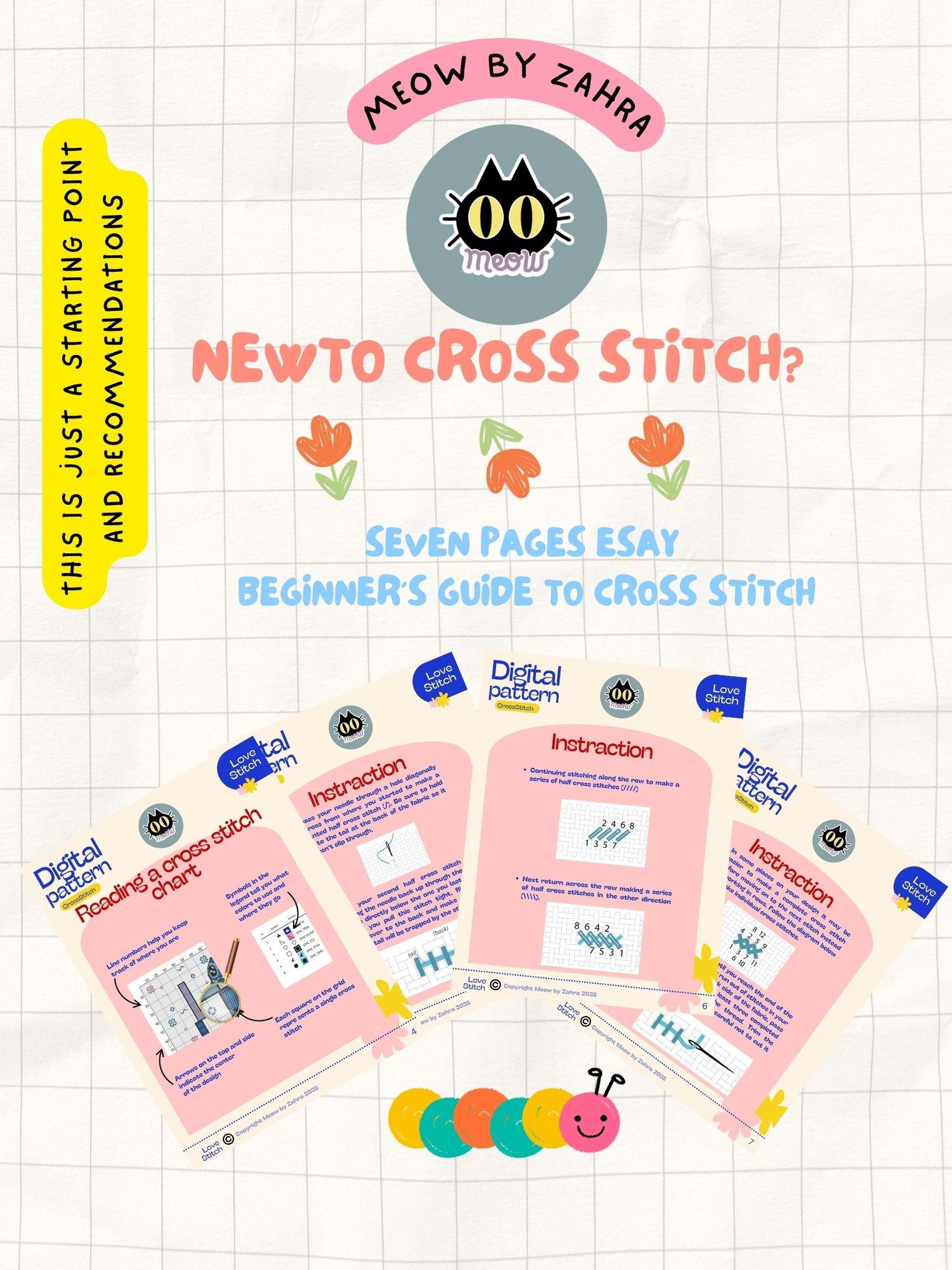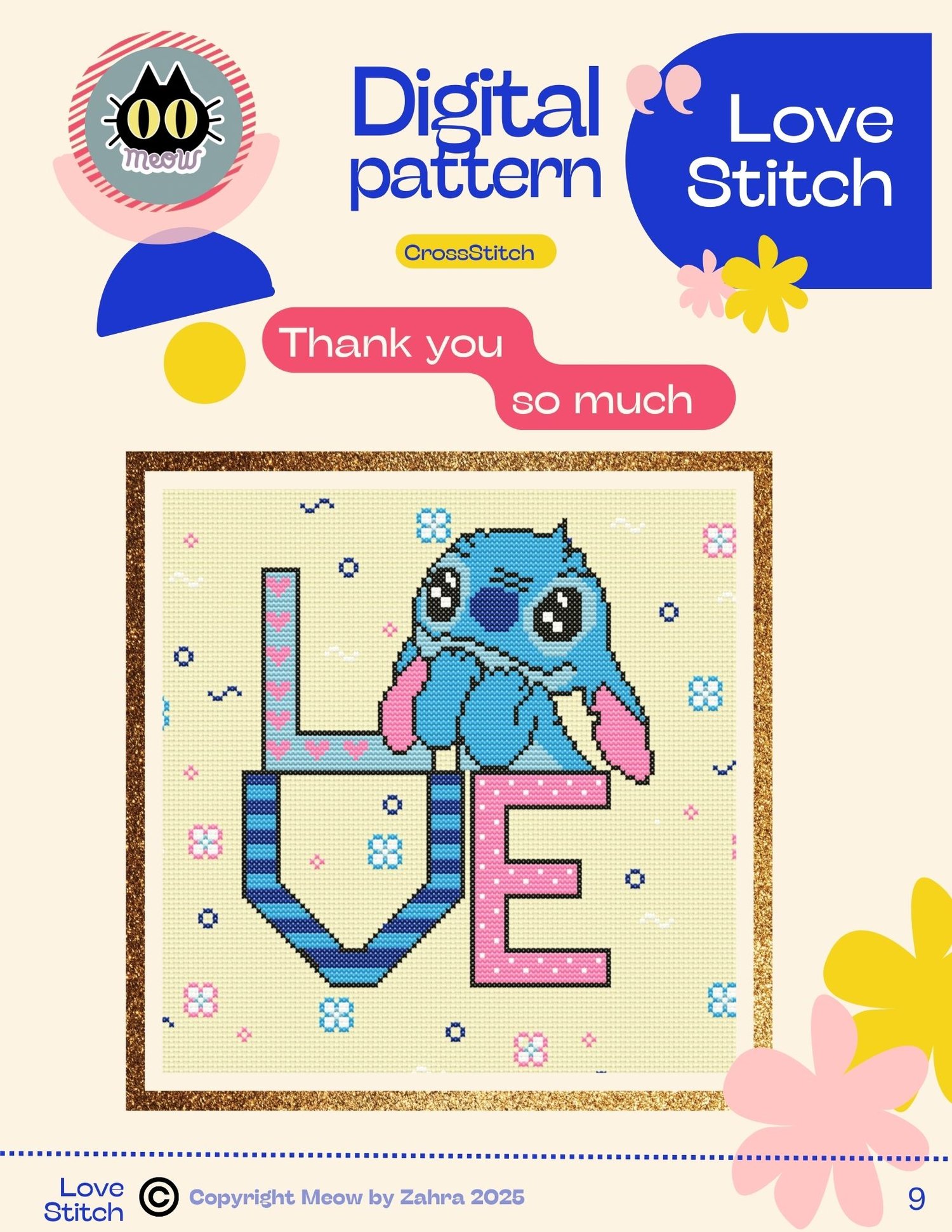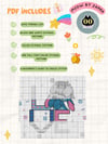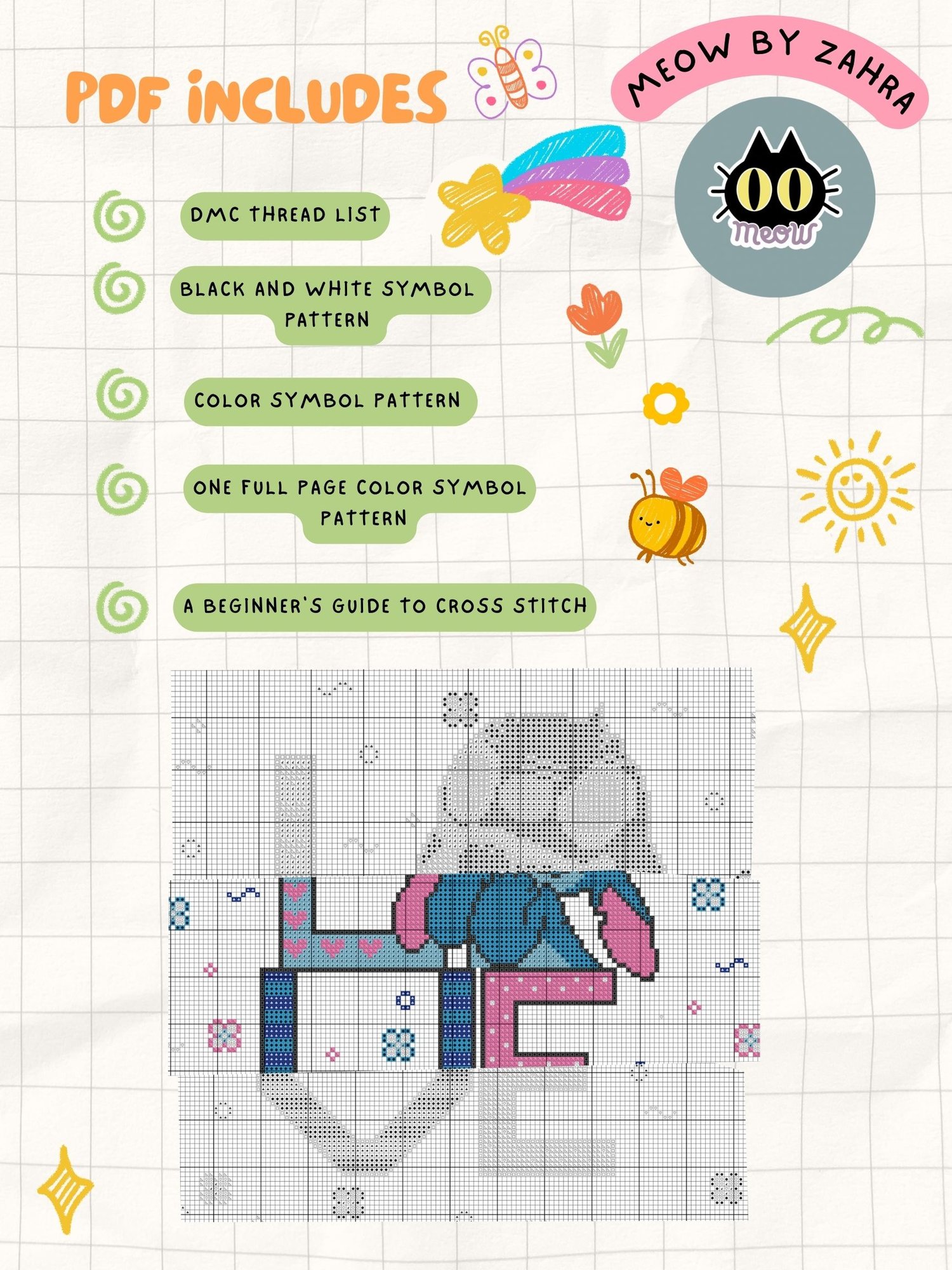 - 4Pdf files with detailed instructions of the cross stitch design. Floss list, symbol