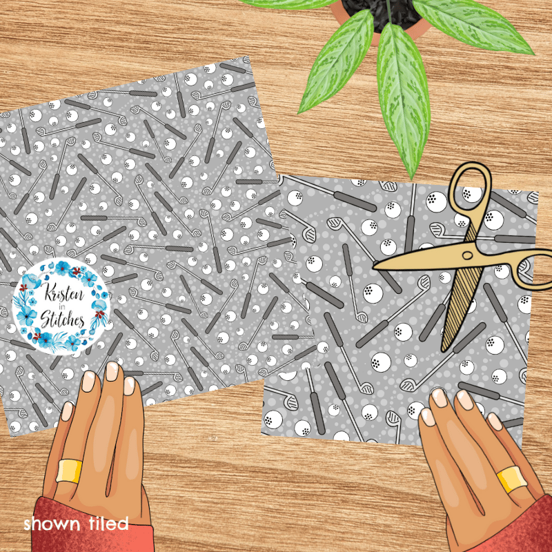 A sports-themed seamless pattern with golf clubs and balls.