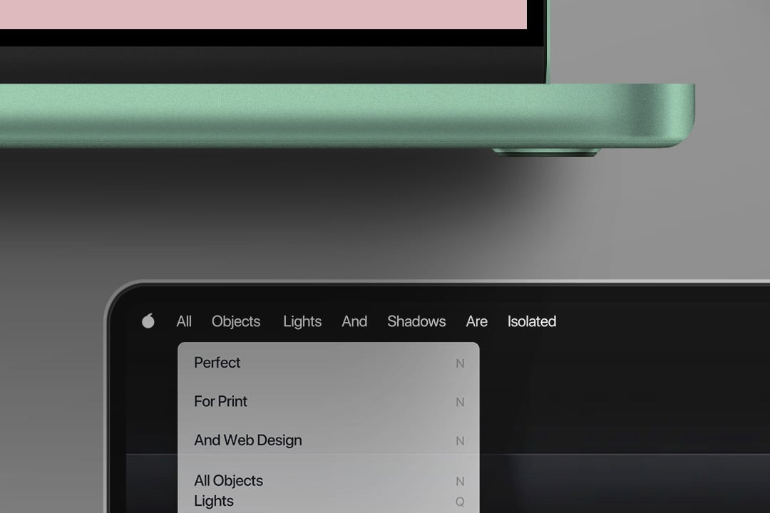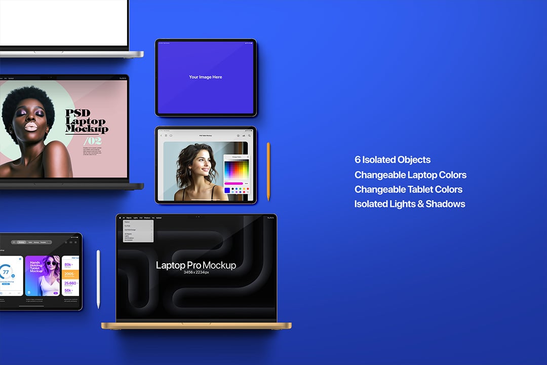 Photorealistic laptop and tablet mockup pack featuring 4 isolated objects: 2 MacBook Pro 16 and 2 iPad Pro 13, with changeable laptop and tablet colors, editable Smart Objects, and independent lights & shadows — 7000 × 5000 px at 300 DPI.