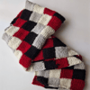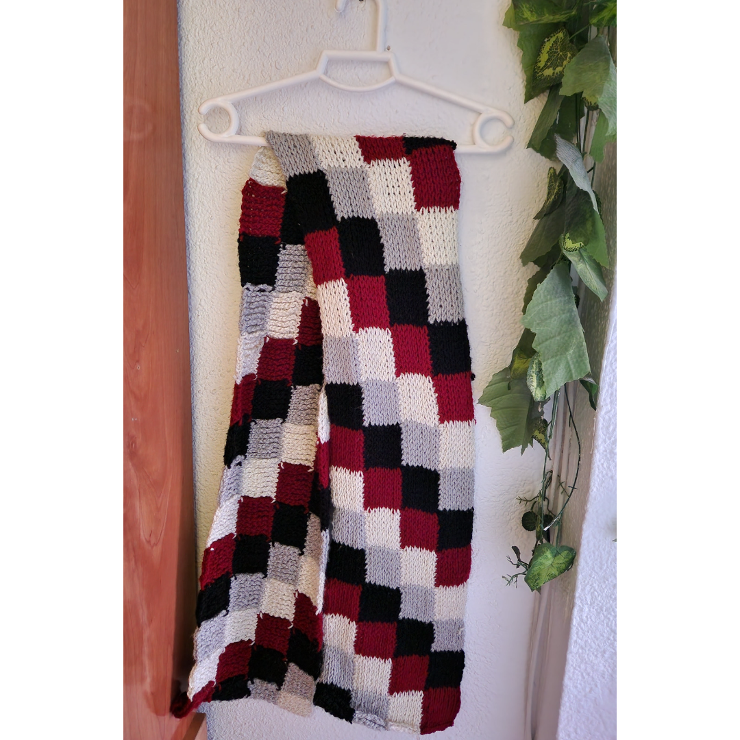 This scarf is made using entrelac crochet, a technique that creates a textured, woven look using diagonal squares. I have adapted the entrelac technique typically used with Tunisian simple stitch to work with the Tunisian knit stitch, making a Tunisian hook unnecessary.