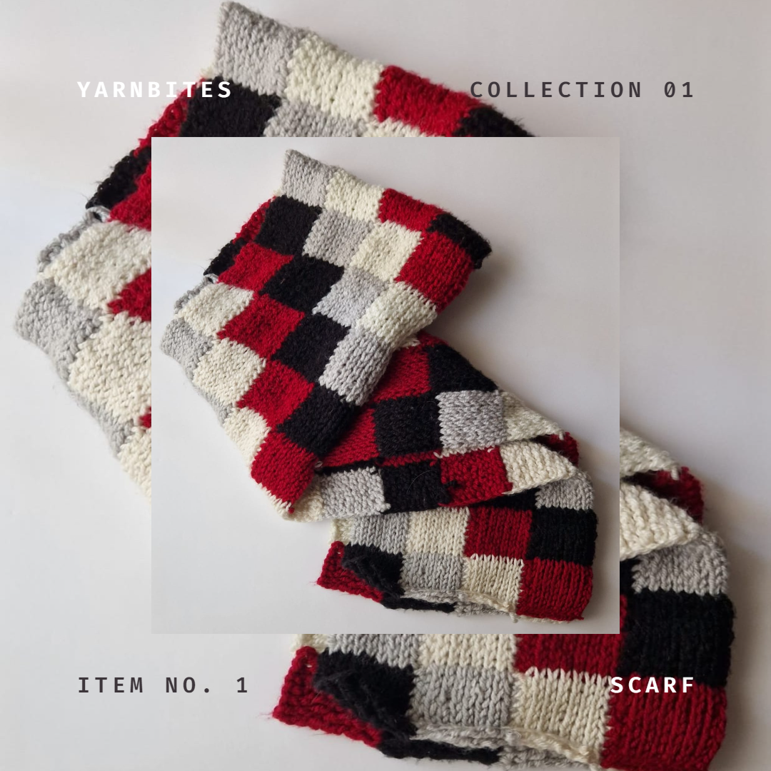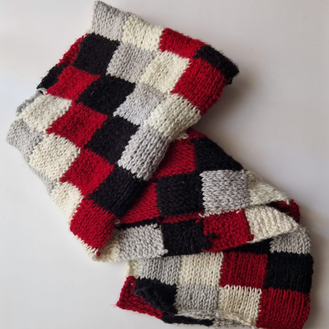 Esta bufanda se hace usando entrelac, una técnica que se construye de manera diagonal cuadrado por cuadrado. He adaptado la técnica que normalmente se usa con punto tunecino simple al punto derecho, así que no se necesita un ganchillo tunecino.