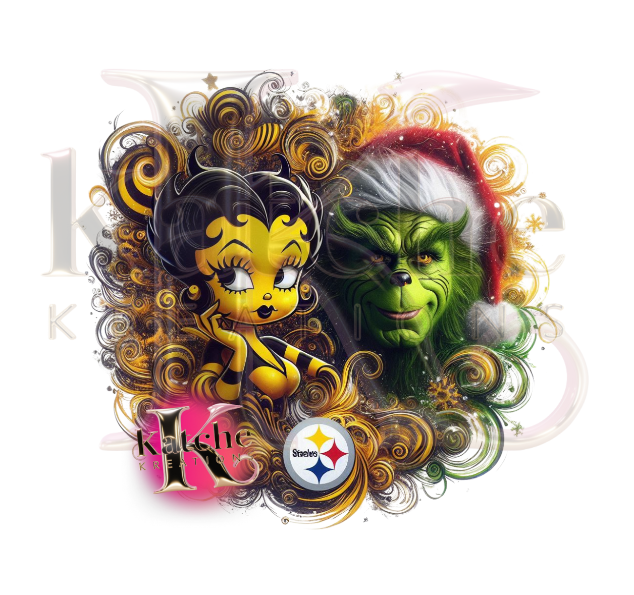 Celebrate the holiday season with a splash of team pride with this Pittsburgh Steelers Christmas Diva & Grinch digital download! Featuring a stylish diva decked out in black and gold alongside the mischievous Grinch in a Santa hat, this design is surrounded by swirling patterns and Steelers-themed colors. Perfect for creating fun and spirited holiday items that show off your love for the Steelers!