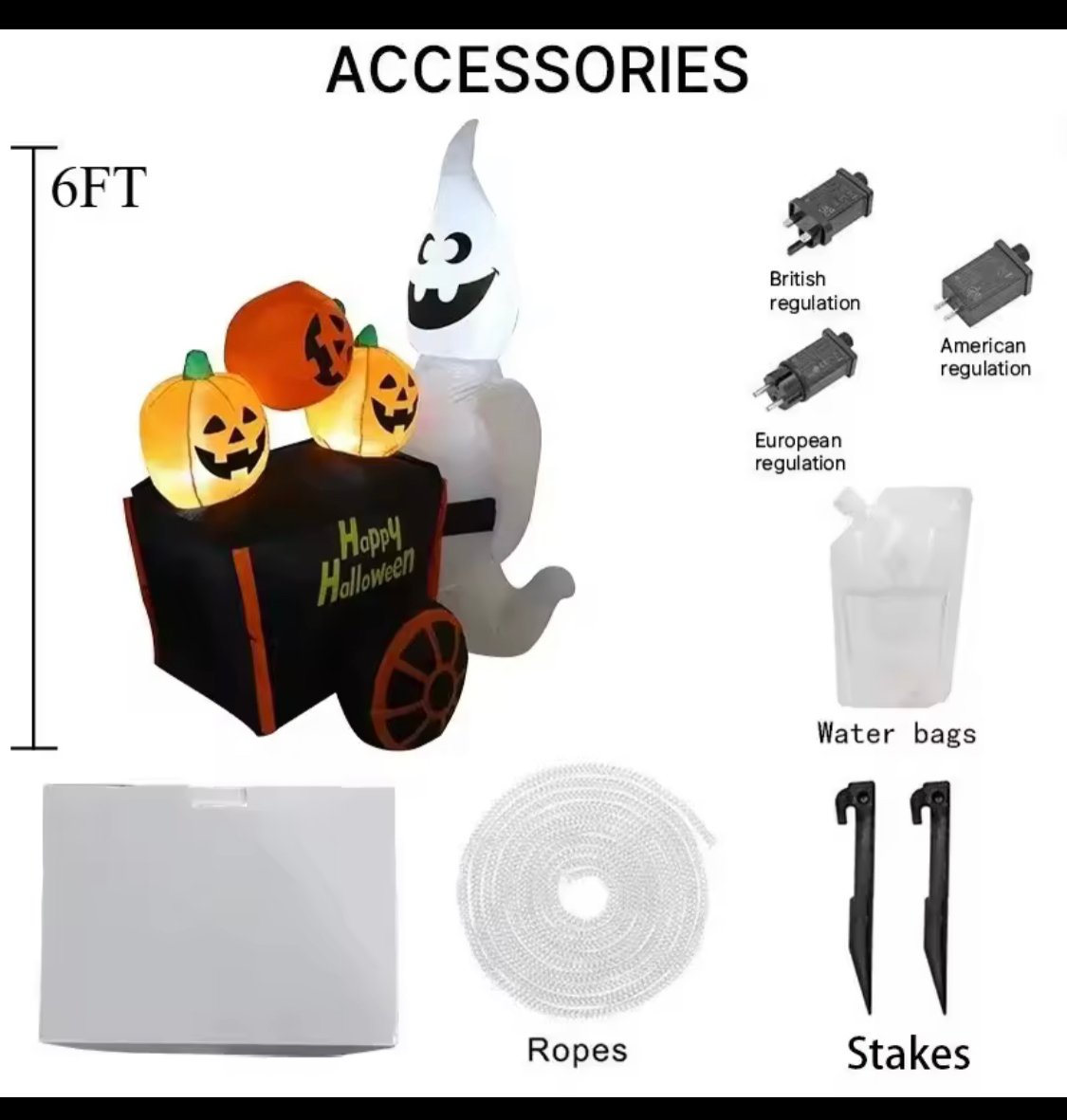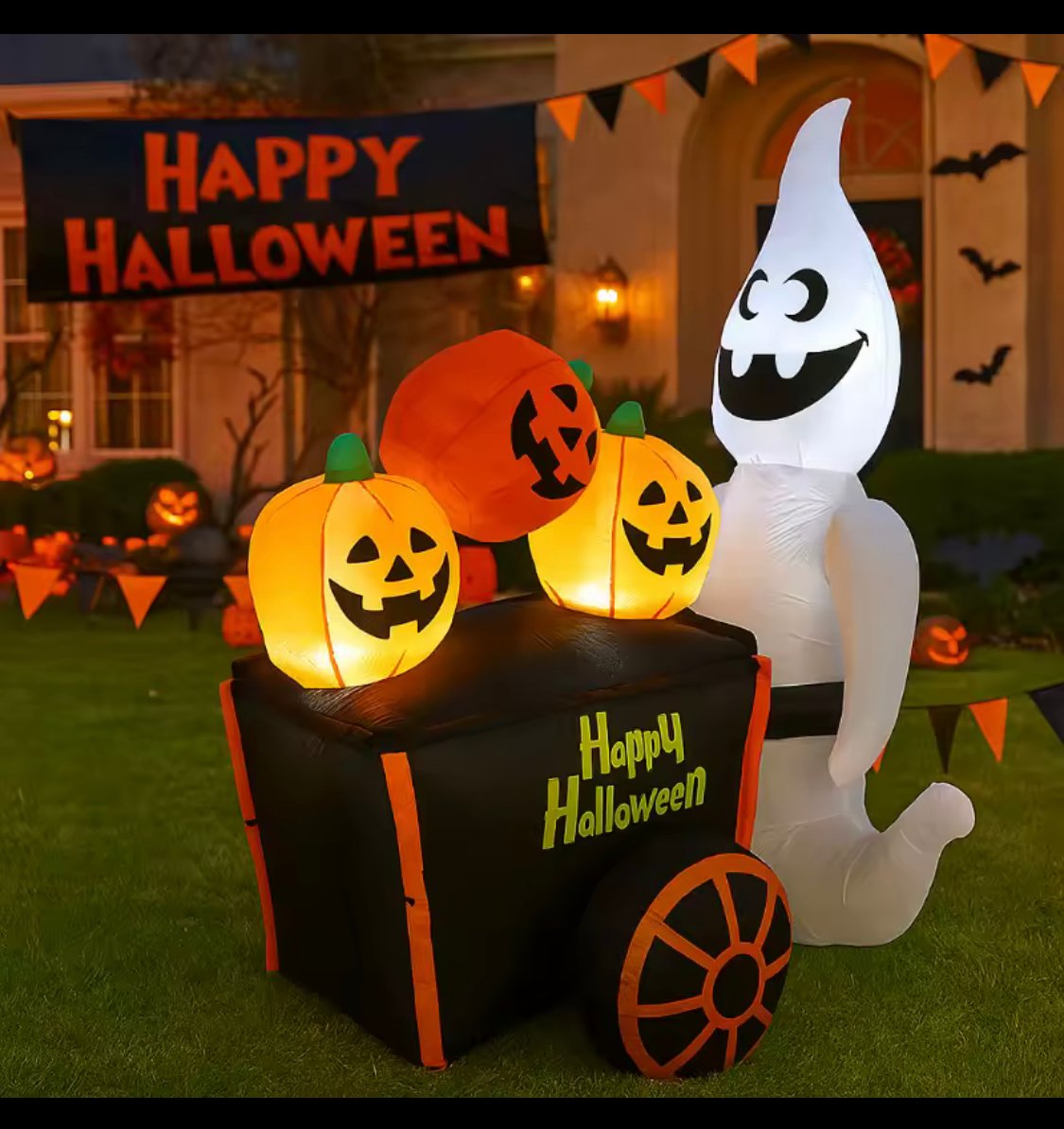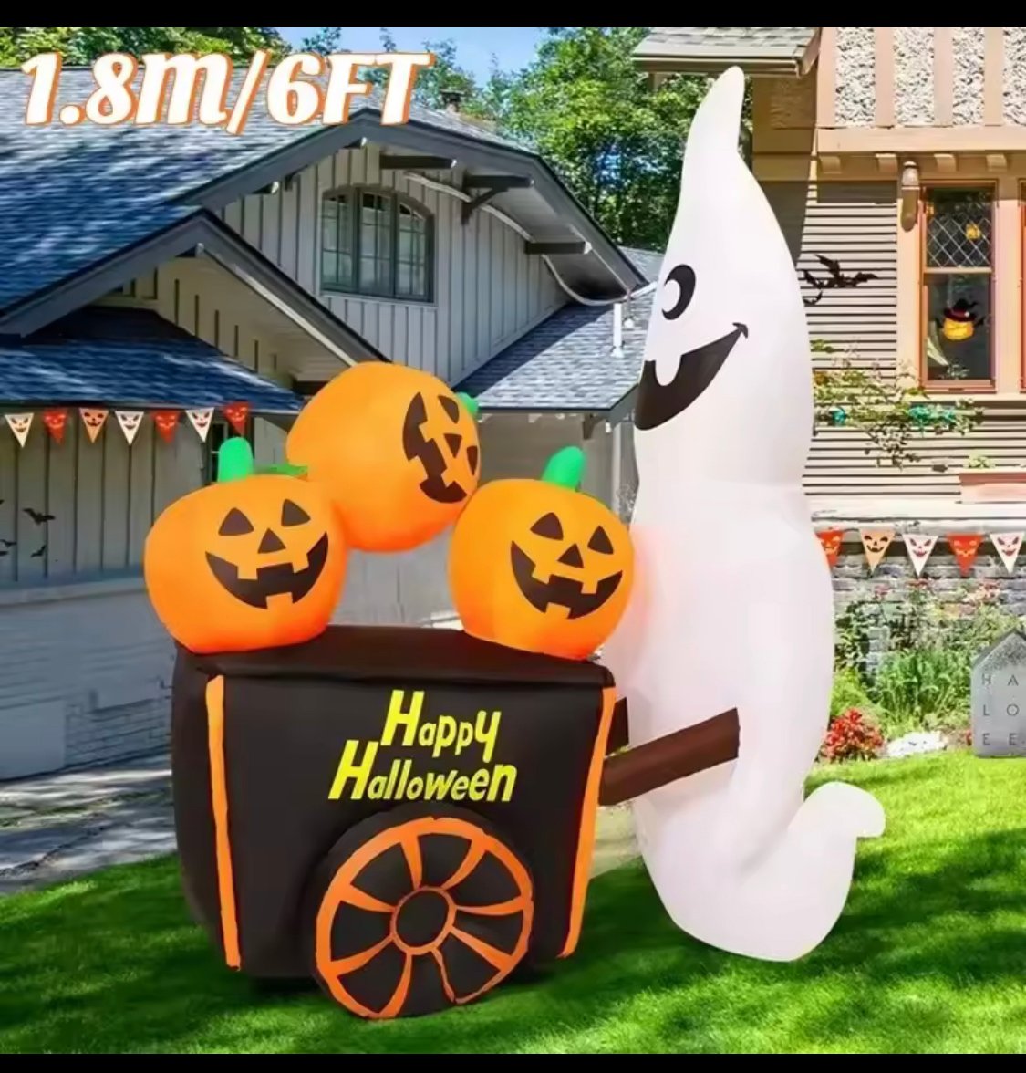 Turn your yard into a spooky fun zone with this 6-foot-tall Halloween inflatable featuring a friendly ghost pushing a cart full of glowing pumpkins! This eye-catching holiday decoration brings a playful, festive vibe to your outdoor space, perfect for Halloween parties, trick-or-treaters, or simply showing off your spooky spirit.