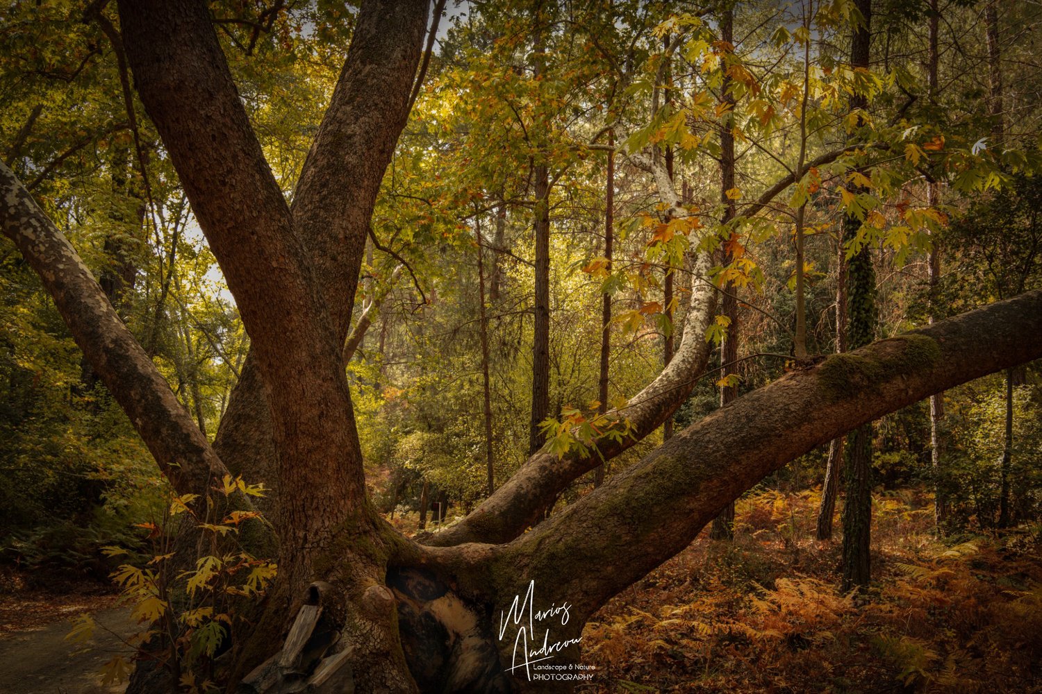 In the tranquil heart of Koilada tou Platy valley, a magnificent plane tree stands, its intertwined trunks reaching out like a welcoming embrace. This photograph captures the warm, golden light of autumn as it filters through the dense canopy, illuminating the forest floor with a carpet of rich, earthy tones. The image invites the viewer to step into a world of natural wonder, where the ancient trees and vibrant foliage tell a story of timeless beauty.
