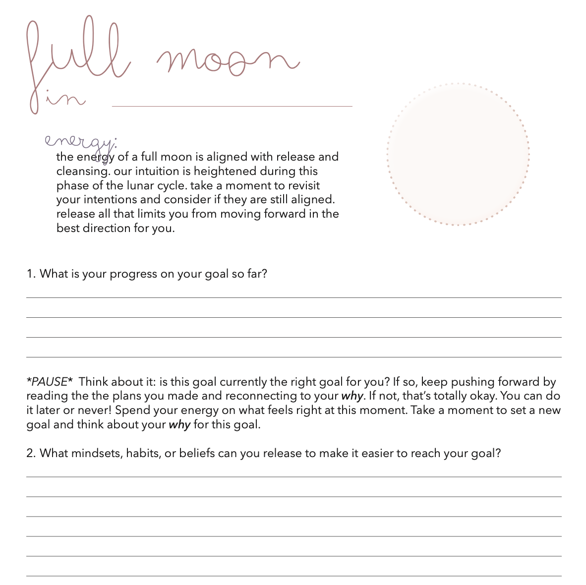 Journal: Includes a unique tarot spread for the new, first quarter, full, and last quarter moon phases or a written journal with guided questions.