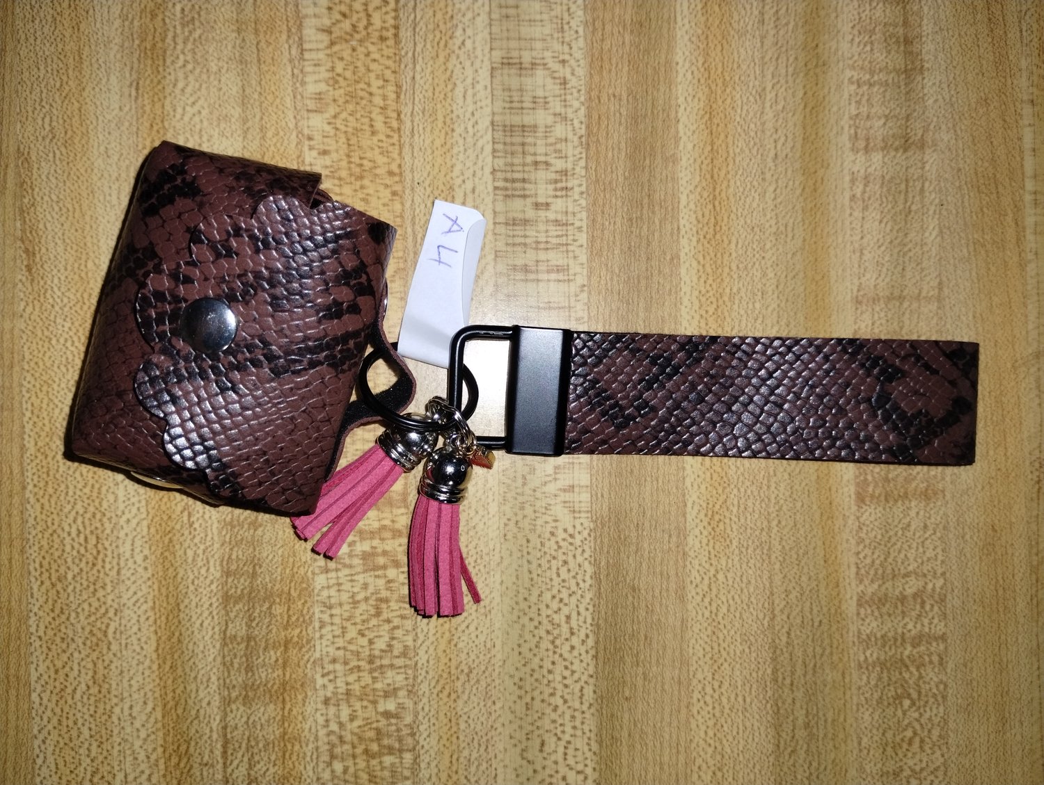 Item A4 Brown animal print Air pod pro case and matching lanyard with pink tassles and a charm.