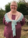 So I designed this shawl as a small item that she could pop round her shoulders whilst nursing the baby. The main body is a pale pink with the edging knitted in a blue yarn.